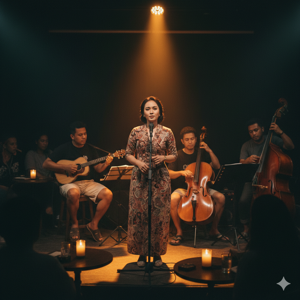 Keroncong tradisional Indonesia, ukulele keroncong, strong suling bambu, cengkok keroncong, penyanyi wanita