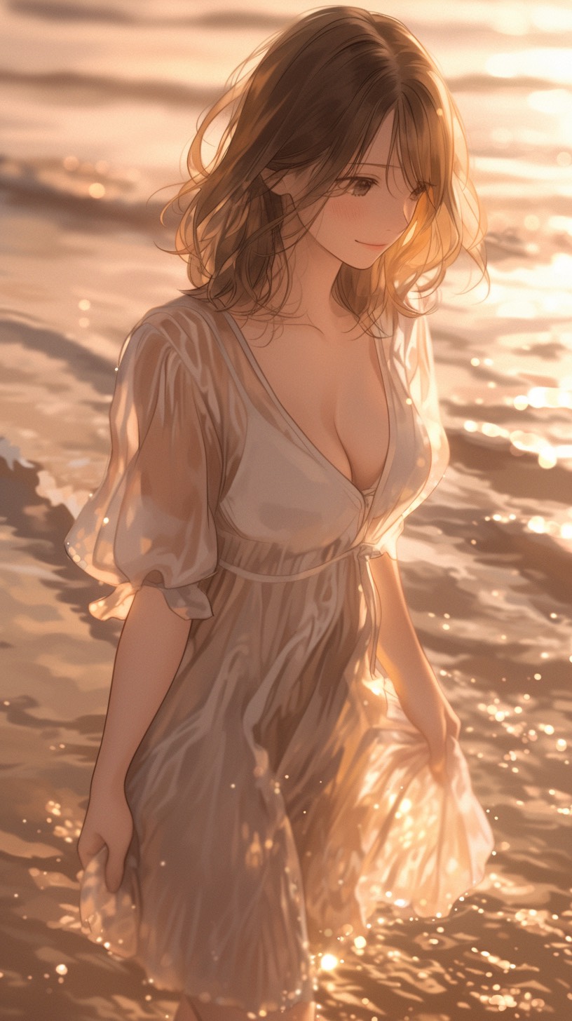The chorus should be particularly catchy and uplifting, contrasting with teffectively, Interlude (4 bars): Guitar solo or memorable piano phrase, Verse A (8 bars): Return to quieter arrangement, Verse B (8 bars): Slightly different arrangement from the first, Chorus (8 bars): Same as the first chorus, Bridge (8 bars): New development, key change or unexpected arrangement, Chorus (8 bars): Final climax, with more emotion, Outro (8 bars): Instruments gradually fade out, leaving only ocean sounds at the end, Chord Progression (Basic): Intro: C - G - Am - F, Verse A: C - G - Am - F - C - G - F - G, Verse B: Am - F - C - G - Am - F - Dm - G, Chorus: C - G - Am - F - C - G - F - G, Bridge: Am - Em - F - G - Am - Em - F - G, Effects: Overall reverb to create a spacious beach atmosphere, Doubled chorus vocals for thickness, Wave sound effects mixed into intro&outro, electropop