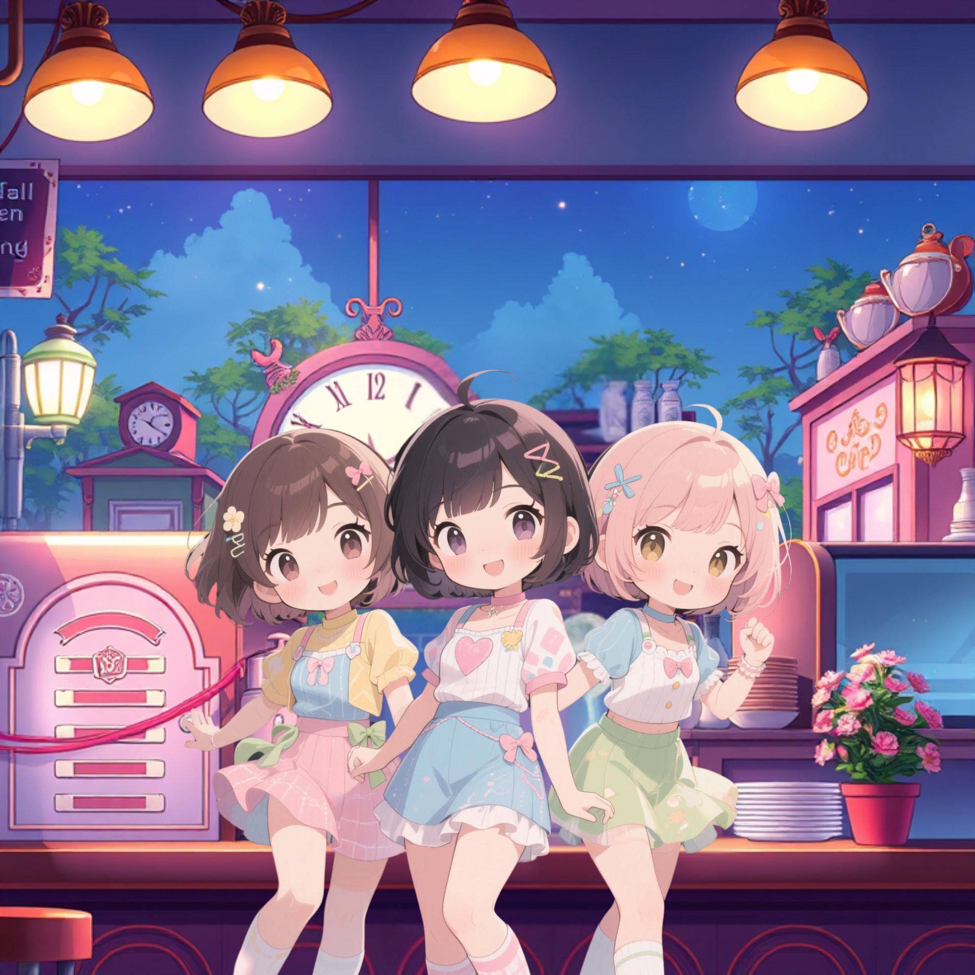 j-pop, idle music, cute girls voice, unison, cute synthesizer sound, professional piano, bpm118, reverb, japanese pop, catchy, British Rock, French pop