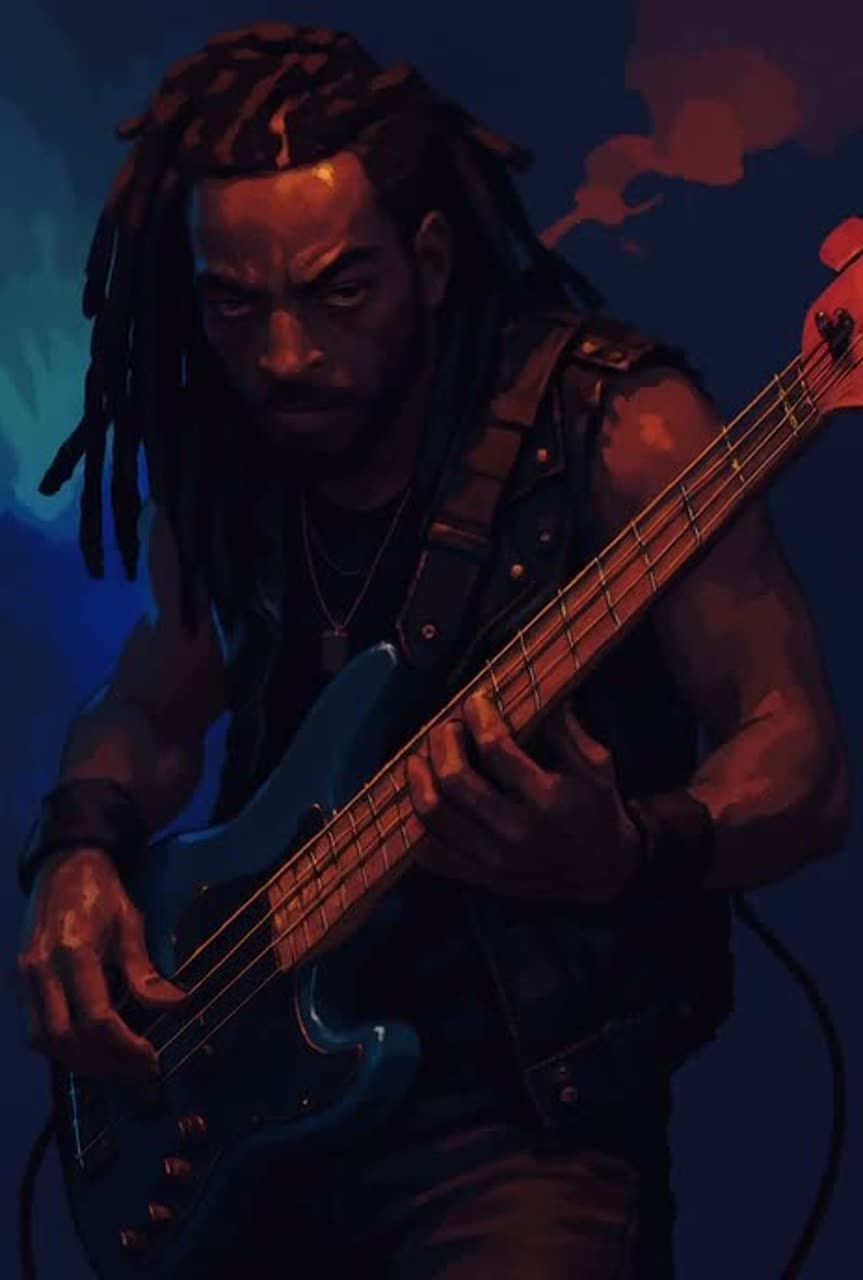 • Bass: fretless/slap, quick tapping, syncopated driving lines with raw edge