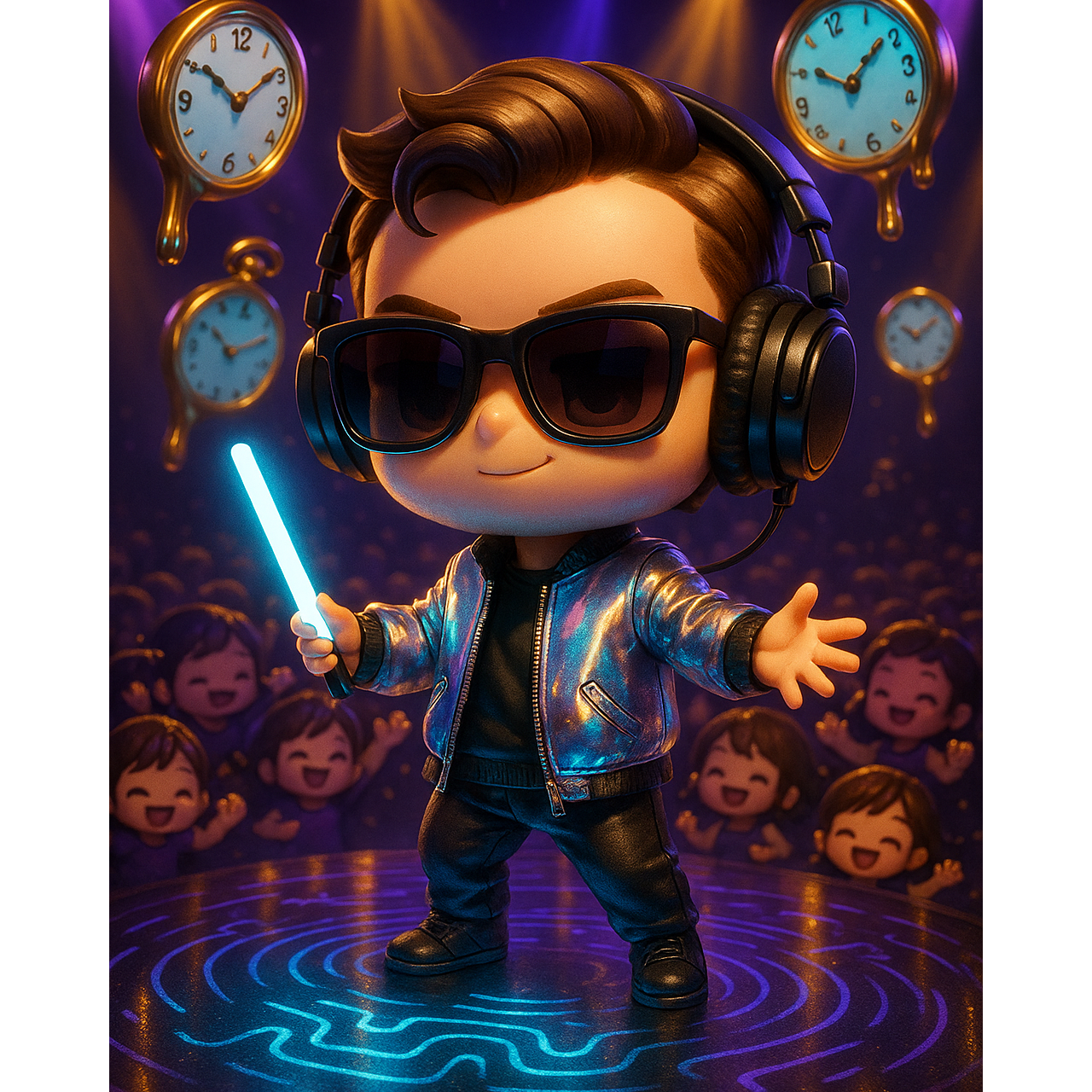 MABG signature funky futuristic electro-pop anthem in theatrical chibi style, Groove-focused track with playful yet commanding attitude; tempo ~124 BPM with tight funk bass, slap guitar, shimmering synths, and cartoonish FX, Vocals: confident, charismatic, MABG-style delivery adapted to chibi tone — fun, expressive, and groovy, Include call-and-response crowd moments, vocoder ad-libs, and theatrical pauses, Mood: humorous but epic; confident and cinematic, Structure: playful spoken intro → funky verse → theatrical pre-chorus → powerful chibi chorus → second verse with crowd chant → bridge → grand finale chorus → comedic outro, Mix clean, dynamic, and wide — chibi energy meets MABG precision