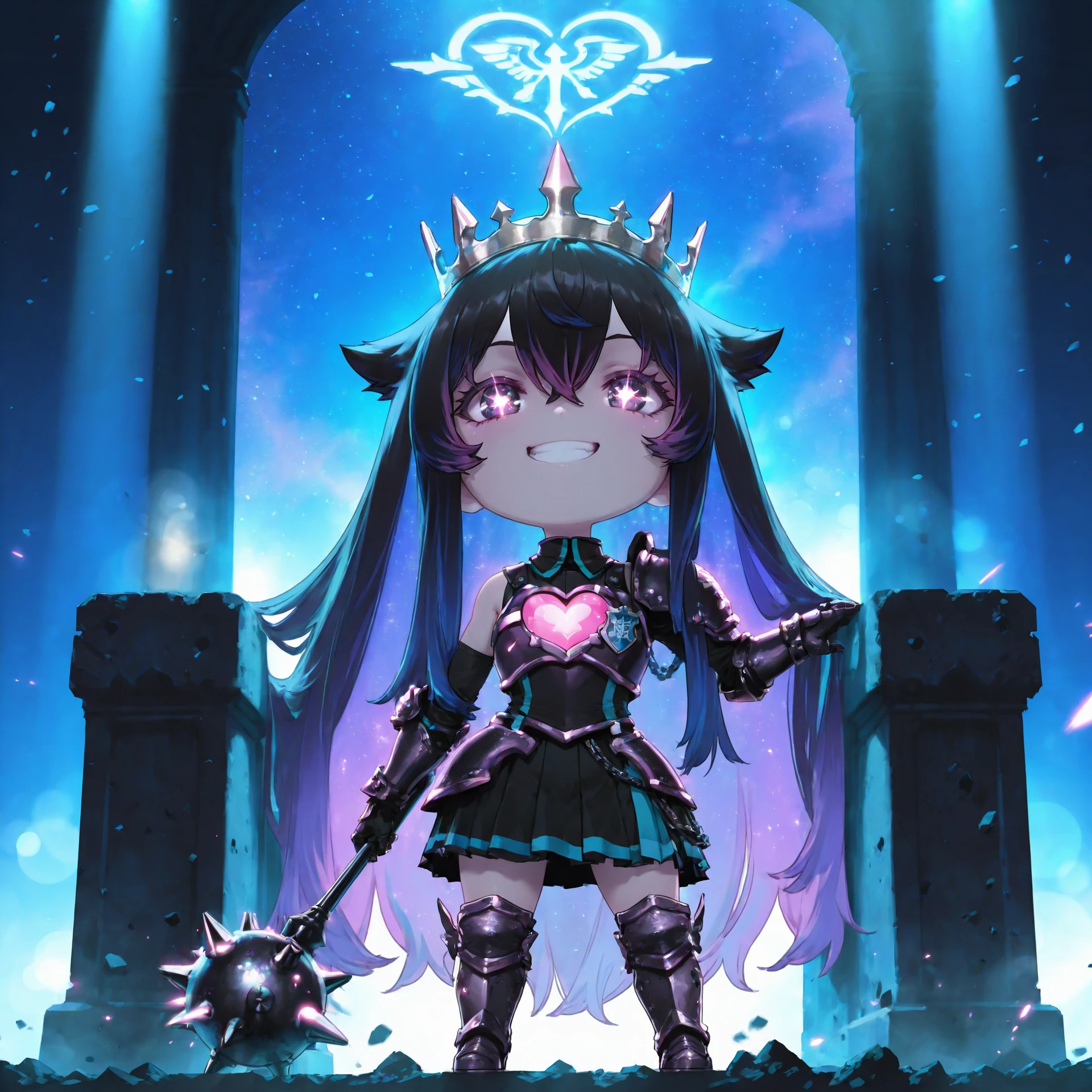 Future Pop/Space Bass track, The female vocal should sound cute and heroic (chibi space girl persona), Use shimmering synth pads, arpeggios, and futuristic sound effects layered over a deep, rhythmic bass line