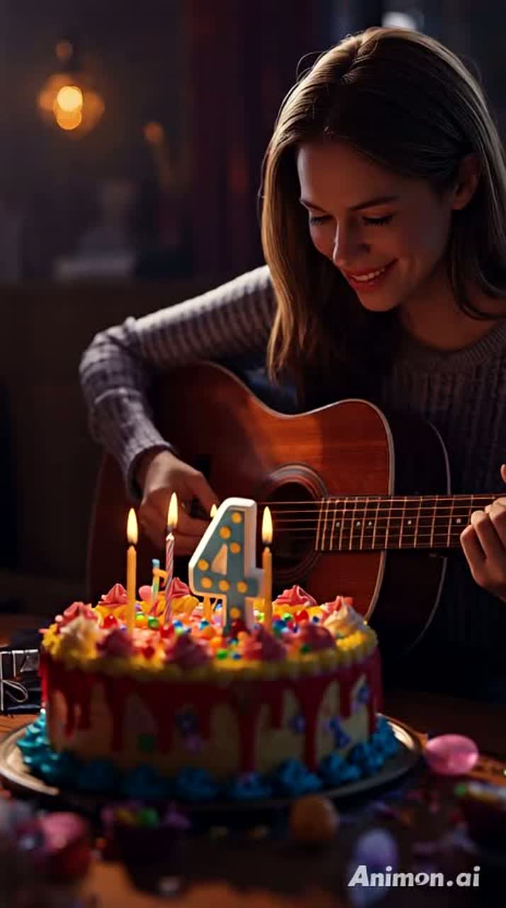 Female solo singer, singing live at a small birthday gathering for a child, Unplugged acoustic guitar only (no piano, no intro), A slow, emotional, and heartfelt ballad with gentle and natural fingerpicking, The guitar sound is warm, slightly rough, and human — with light string noises that make it feel real, The singer performs tenderly and lovingly, as if singing directly to the child, full of affection and hope for their future, Recorded in a quiet, cozy room, with subtle natural reverb, Soft background ambience — faint laughter, light chatter, and the sound of candles being lit — gently fades out as the singing starts, The song begins immediately with the chorus, no instrumental intro, Toward the end, include spoken ad-libs, softly saying “Happy birthday… I love you, ” in a natural, emotional way, as part of the performance, The overall feeling should be warm, sincere, and intimate, like a real live acoustic performance by a caring parent or family member