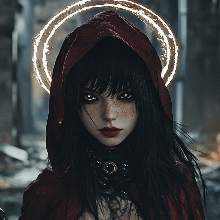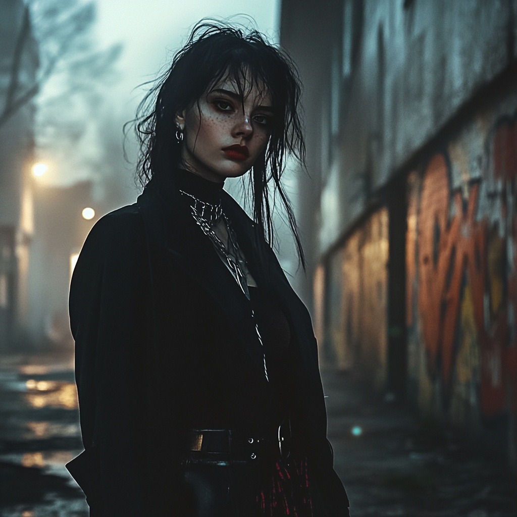 Darkwave Nu Punk Metal: pounding distorted bass, industrial drums, gritty synths, abrasive reverbed guitars, Snarling female chant vocals blend with aggressive riffs, intense choruses, and a haunting, stripped-down bridge enveloped in a brooding, ominous atmosphere