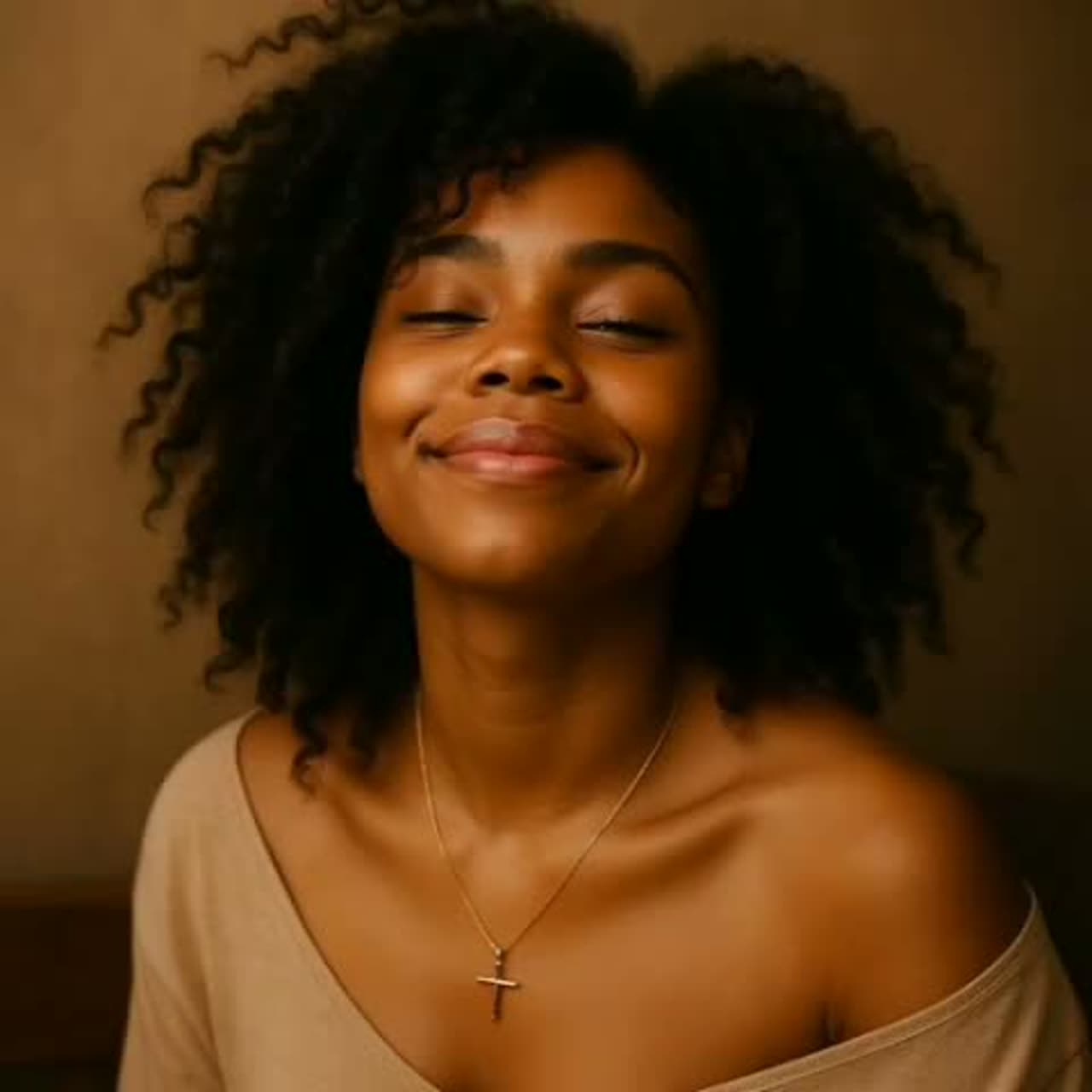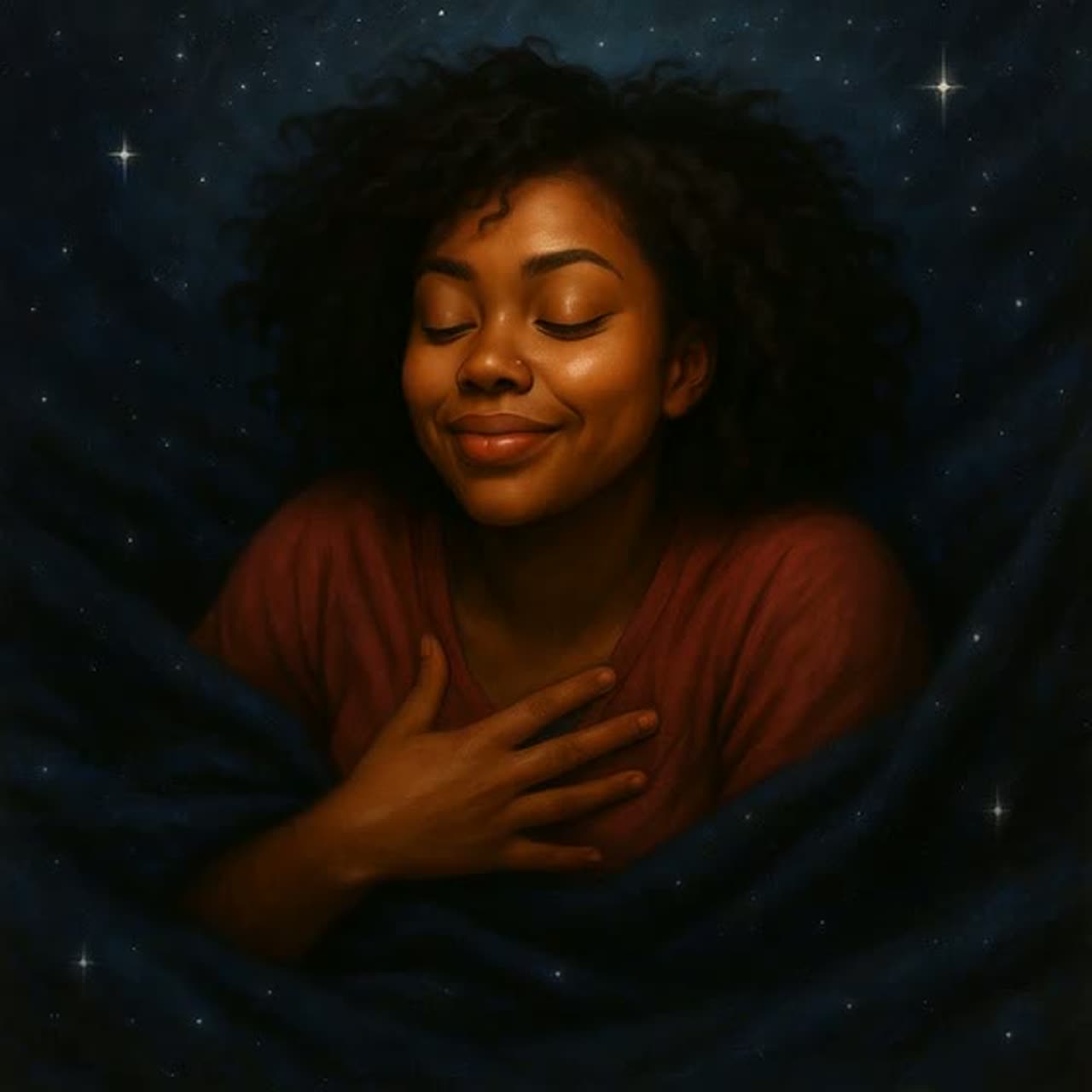 “Warm, intimate Alt-R&B and Lo-fi Soul ballad, Tempo slow with soft Djembe percussion, lush Rhodes chords, and layered ambient textures, Female vocal is delicate, emotional, and conversational with whispered ad-libs and smooth harmonies, Incorporate subtle vinyl crackle and gentle reverb to create a cozy, dreamlike space, Verses are romantic and vulnerable; the chorus blooms with layered vocals and shimmering synth pads, End with soft humming and fading harmonies to mirror peace and closeness, Mood: blissful, romantic, soulful, cinematic, ”