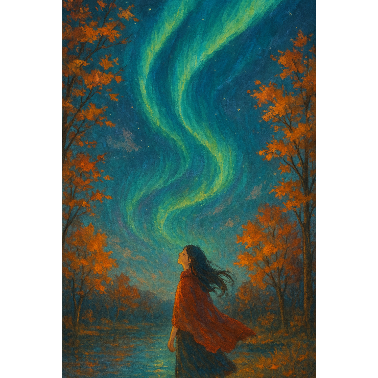 Ambient IDM track with poetic female vocals, inspired by the quiet beauty of autumn nights and the imagined glow of aurora drifting across an October sky, The intro begins instantly with a soft reversed chime or ambient shimmer—no long buildup, allowing vocals to enter quickly, Delicate glitch percussion, granular textures, and airy pads create a floating sensation, layered with gentle piano or sparse violin phrases, The rhythm is fractured and slow-moving, evoking the stillness and introspection of fall, Lyrics are minimal and poetic, primarily in Japanese with subtle English phrases woven in, arranged in short two-line verses, The sound palette is warm but transparent—burnt orange, soft gold, and deep midnight blue tones rendered in sound, Avoid heavy bass or aggressive elements; focus on gentle distortion, soft pulses, and dynamic stereo space, Keep the track under 3 minutes, Dolby Atmos