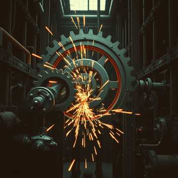 High-speed, non-stop industrial hard rock instrumental at 188 BPM in E Phrygian, Hit instantly: dirty lo-fi drum loop → low, rising fuzzy guitar motif → anthemic riff, Relentless four-on-the-floor with heavy swing; only micro 1-bar collapses, Machine-staccato “Blitz” riffs with metallic stamping SFX, tritone/b2 color; “Third Eye” filtered arps + ring-mod; synth-bass sprint; chaos guitar freak-out; wah solo while the sprint continues, Trickster/joker vibe via stutters/stop-go (no licensed IP), Mix: kick+bass centered, wide fuzz, SFX forward, Mood, Genre Tags: industrial metal, groove metal, electronic rock, stomping, menacing, groovy, apocalyptic, fuzz guitar, instrumental