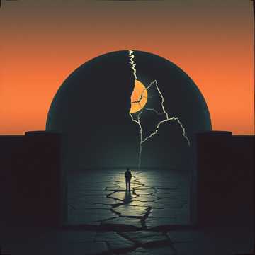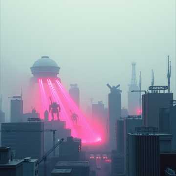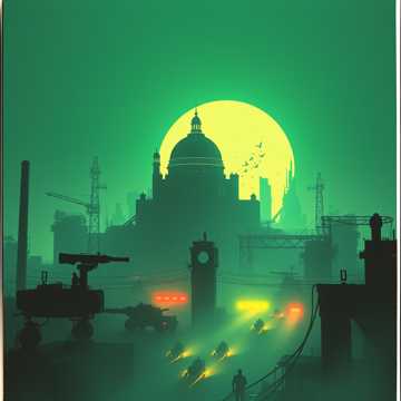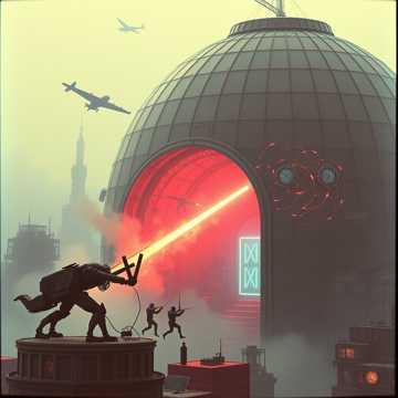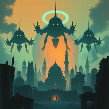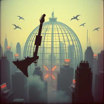 Non-stop, high-speed industrial hard rock instrumental at 196 BPM in Eb Phrygian, Maintain “maximum from 0s” energy: rising fuzzy guitar over dirty drum loop, with rights-cleared fragmented pre-battle whispers/laughter running throughout, Depict invaders breaching a domed world: machine-staccato “Ganesha Siege” riffs (metal stamping SFX, 3–3–2 accents, tritone/b2 color), psychedelic “Third Eye” overwatch arps, FM-style bell as an abstract relic of the dome civilization (no melody quotes), Add synth-bass lead column, rising half-step interlude, noise incursion, wah-first solo; final “Enrage” stack and annihilation, then radio blackout, Mix fat and clear: kick+bass centered, guitars wide, FM bell mid-focused, SFX forward; no full breaks, only ≤1-beat stutters