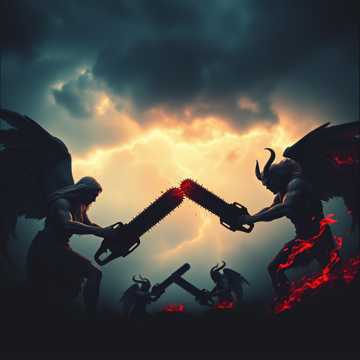 An instrumental depicting a brutal, high-speed war between angels with chainsaws and demons reveling in combat, Maintain the 'climax from the start' speed-rock energy, The track embodies a duality: the angels' cold, mechanical violence (precise, machine-gun staccato riffs; a fast, clean arpeggio section) versus the demons' primal joy for battle (a wild, galloping main refrain; a flamboyant, emotional guitar solo), The structure is dense and epic, featuring a heavy half-time stomp section, a menacing bass feature, and a classic heavy metal dual-guitar harmony section, painting a picture of a relentless, holy-unholy war, Mood, Genre Tags: instrumental, holy war, relentless, epic, duality, angelic, demonic, mechanical precision, organic chaos, speed metal, hard rock, neoclassical metal, battle theme, boss music