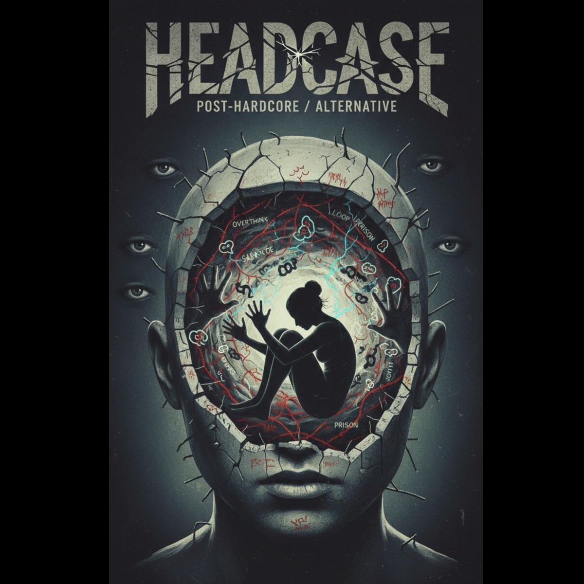 Style: Post-hardcore / alternative, Dynamic song with tension and release, layered guitars, modern clean production, Mix of melodic sections and aggressive moments, Male vocals with emotional clean singing, layered harmonies, and bursts of raw grit, Mood / Theme: Mental spirals, overthinking, anxiety, self-labeling as “the problem, ” Living trapped inside your own head while learning to coexist with it, Lyrics direction: Melodic introspective verses, rising pre-choruses, big emotional choruses, Bridge drops into darker half-time intensity before a powerful, layered final chorus, Lyrics focus on internal conflict, panic, and self-acceptance, Vocal delivery: Vulnerable and melodic in verses, tense and urgent in pre-choruses, explosive and emotional in choruses, controlled aggression in the bridge