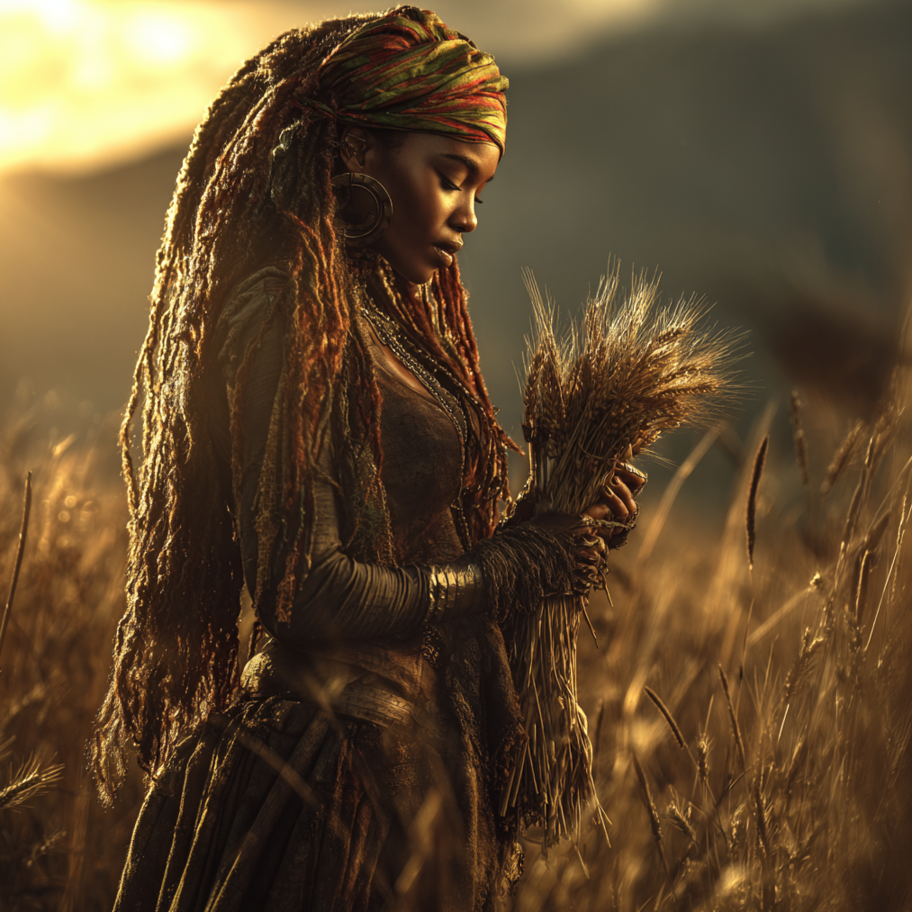 Mid-tempo Afro-folk and island soul blend (~90 BPM), Acoustic guitar and soft nyabinghi hand drums form a steady roots sway, Warm upright bass and gentle shakers keep the rhythm grounded, Subtle flute and steel pan melodies drift like evening wind, Nyah’s vocal glows with smoky warmth and devotional poise — patois-inflected verses, tender melodic choruses, Backing harmonies echo each vow like a prayer, Production feels organic, earthy, and golden — rich analog tone, sunset reverb, Lyrical themes of loyalty, divine favor, and love that grows from faith, Inspired by Ruth’s journey from exile to legacy — humble strength, sacred romance, quiet miracle, Think a twilight field of grace