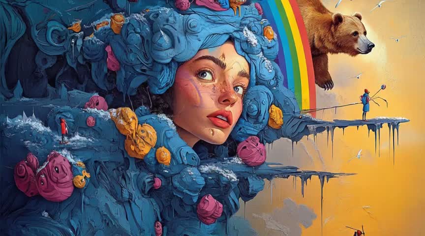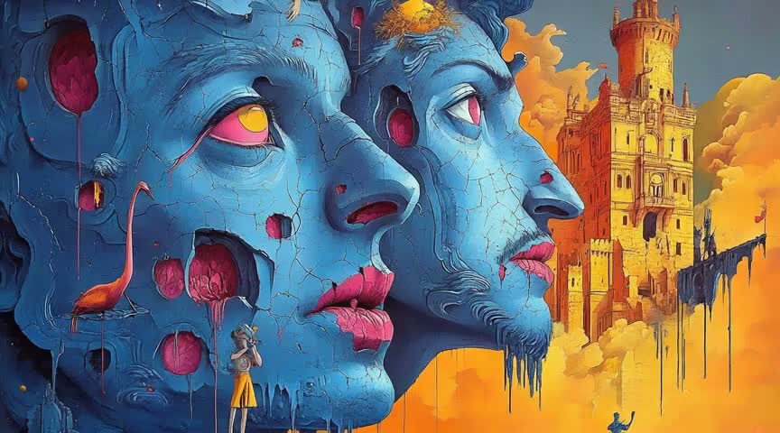 Hi-RES, 432Hz, Fast Tempo, 3D layered, Surround Sound, sweet female yodelling, A hypnotic blended theatrical fusion of Peking opera mask-shifting aesthetics and angular avant-garde rock, opening with metallic pipa harmonics and rising cymbal swells mimicking the tension before a face change, quickly launching into 150 BPM distorted guitar riffs intercut with traditional gong strikes and Beijing opera vocal samples modulated through glitch filters, verses feature sharp dizi runs and polyrhythmic drumming layered under operatic shouts pitched into mechanical stutters, chorus explodes with shifting tonalities as if each measure "changes face, " blending noise walls, dissonant synth clusters, and sudden silence cuts, bridge breaks into an eerie erhu solo echoing in delay spirals before collapsing into chaotic percussion and tape-stop effects, ending with a single opera gong reverberating under a digitally shredded mask reveal