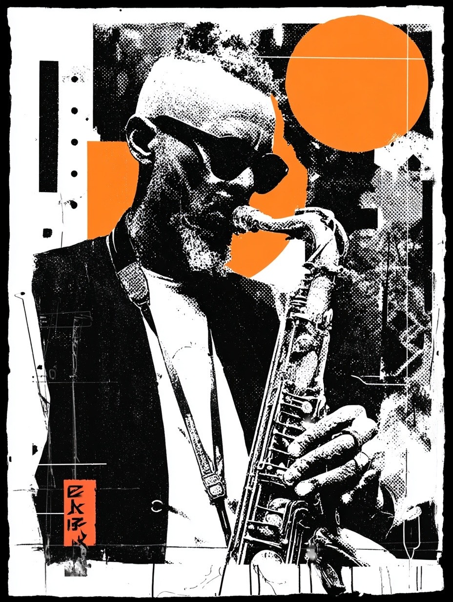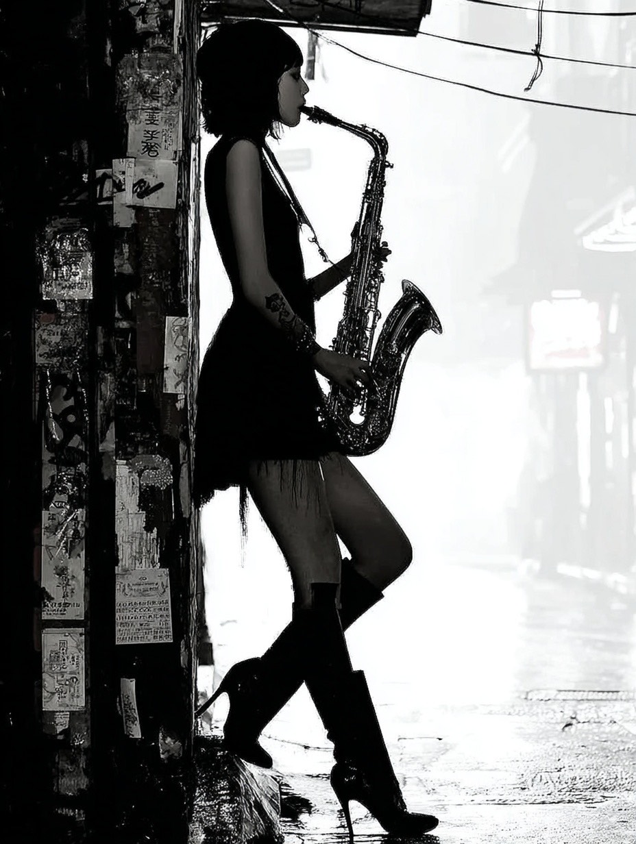 (Full breakbeat kicks in with sharp, percussive edges, Sax becomes more abrasive and urgent, Maintain a sense of speed and decay, evoking a dystopian industrial district, )