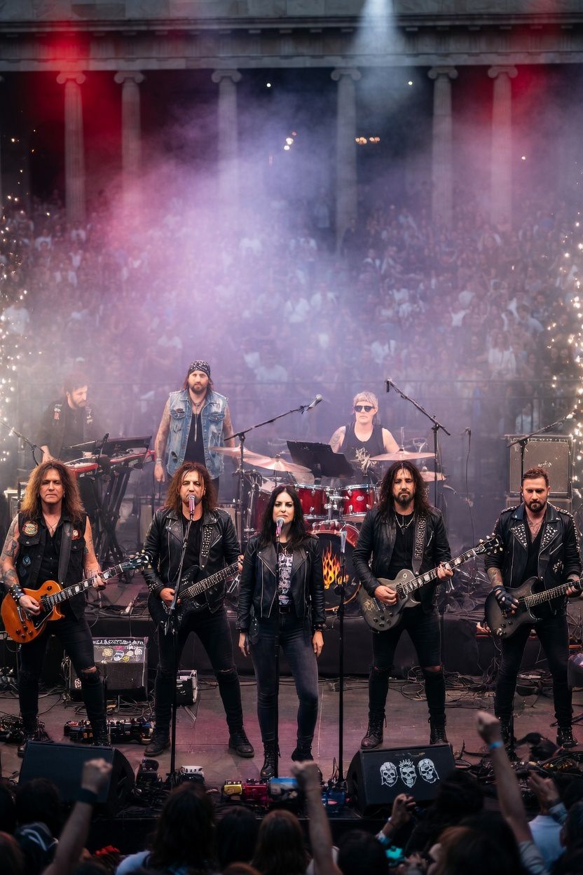 Audience_singing, Metal, Hip_Hop, Crowd, Live, Stage, Big_Audience, [Starke, kontrastreiche Farben] [Publikum aktiv eingebunden] [Bewegung und Mitwirkung zeigen] [Kraftvolle, positive Energie] [Klare Refrains, die zum Mitsingen animieren] [Publikum als Herz der Performance] [Gemeinsame Reise von Bühne und Publikum], female vocals