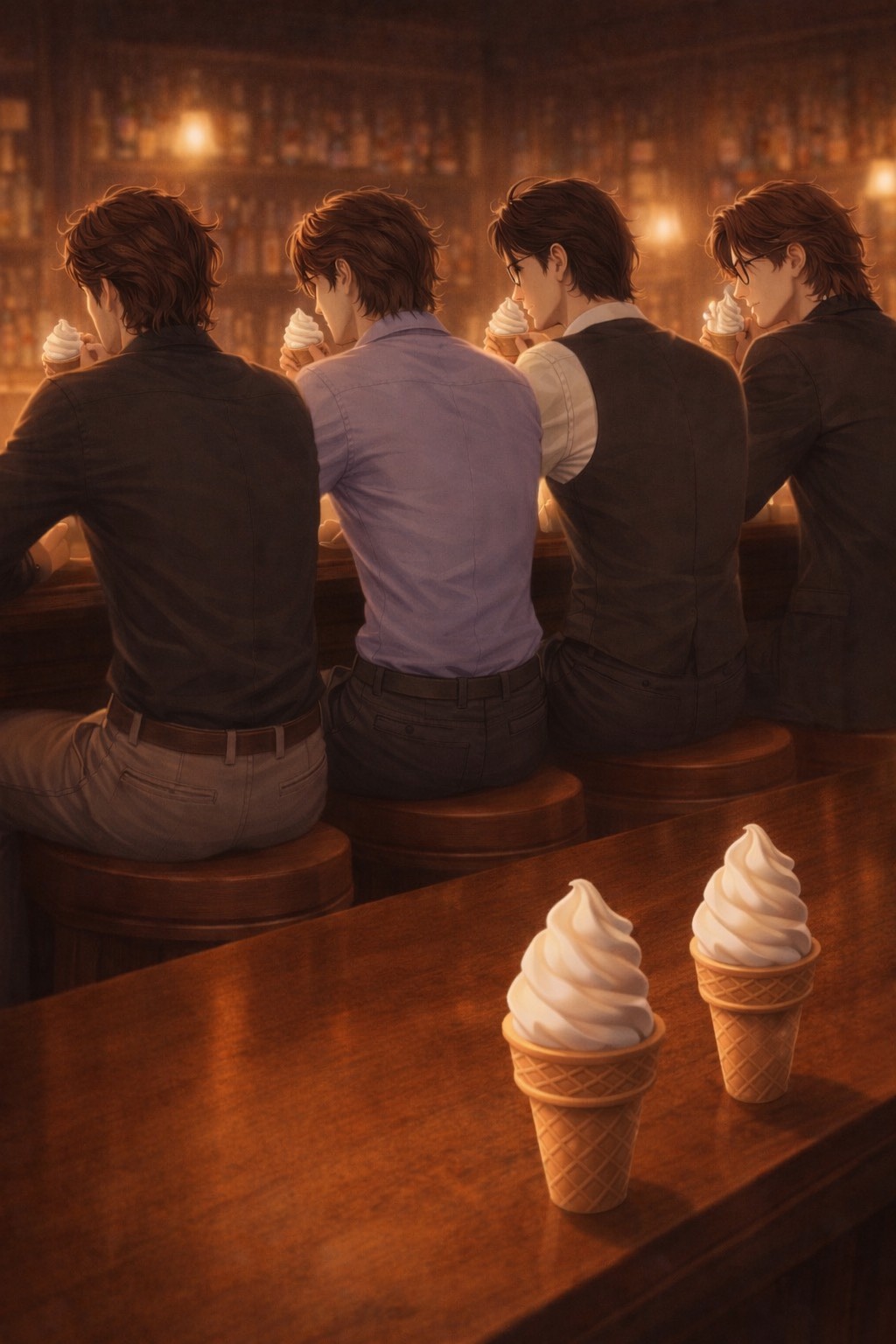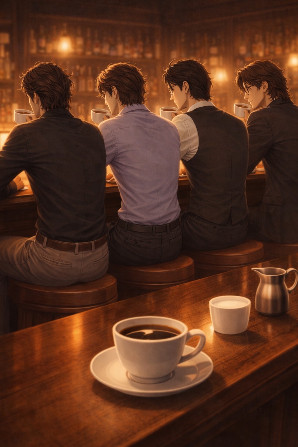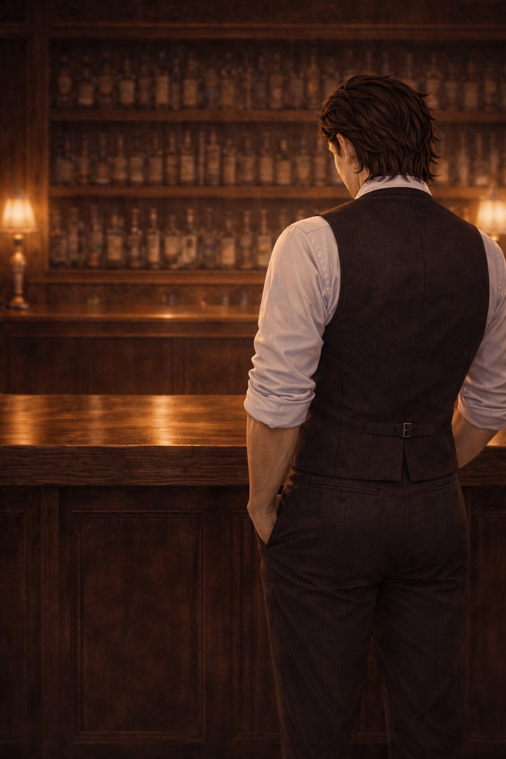 Male vocal with a mature, calm presence, Low to mid-low range, Relaxed delivery, slightly breathy, No belting, no youthful pop tone, Confident, gentle, bartender-like voice, Feel: