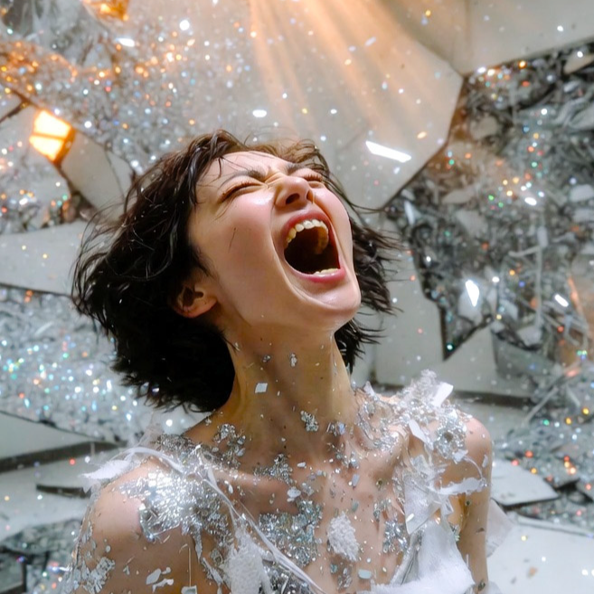 J-Rock, Math Rock, Chaotic, Intricate Electric Guitars, Technical Guitar Tapping and Sharp complex riffs throughout the Chorus, Rapid-fire Drumming, Polyrhythmic, Heavy Driven Bass, High-tension Female Nervous Vocal, Emotional and Fragile singing, Breathless, Flip voice, Screaming, High-pitched powerful delivery, Melancholic, High Energy, Aggressive, 188 BPM, Sharp sound production, Professional sound mastering, Clear high-end, Bass Boosted
