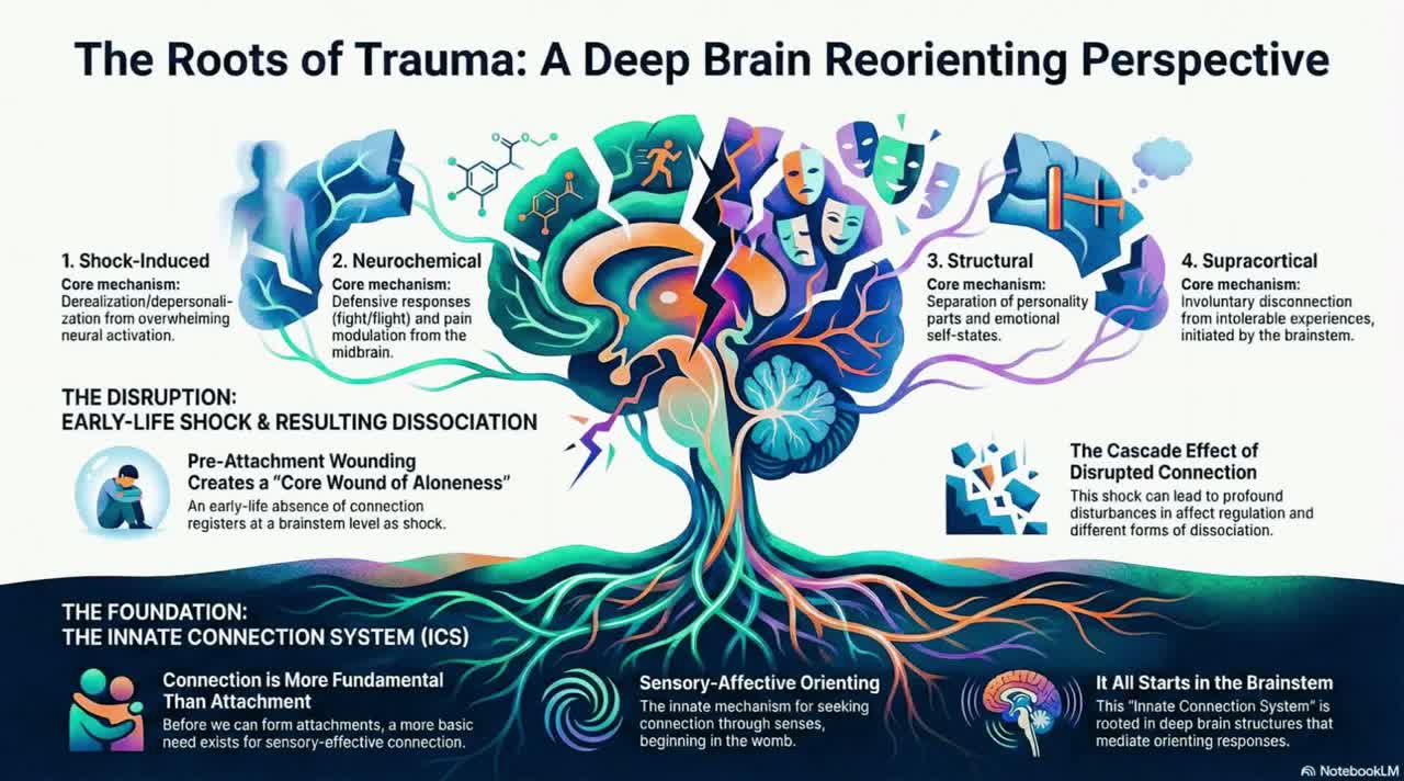 Lyrically explores birth trauma in premature and low-birth-weight infants, focusing on vestibular and implosive shock, PAG activation, reticular tone loss, and midbrain circuitry, Incorporates educational references to periaqueductal gray, superior colliculi, vestibulocerebellum, reticular formation, amygdala, insula, and hypothalamus, Describes the physiology of dorsal collapse and reorientation through Deep Brain Reorienting (DBR), “clinical ambient”