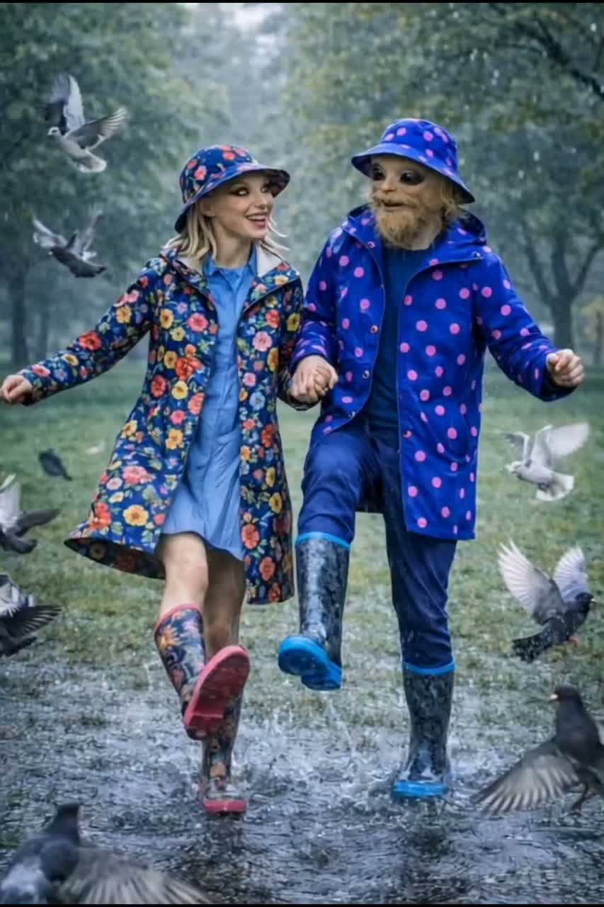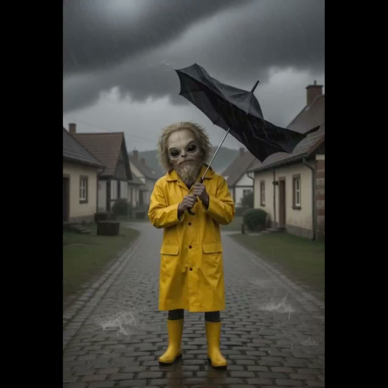 Cinematic storm folk rock, powerful and dramatic atmosphere, 95 BPM, Heavy rain ambience, thunder in the background, deep cinematic drums, driving bass, electric guitar swells, dark synth pads, emotional strings, Strong expressive male lead vocal with echo and intensity, Verses atmospheric and mysterious, chorus big and powerful, Theme: alien wanderer named Darek in a yellow raincoat walking through a stormy village street, looking at the sky, feeling the rain like signals from the stars, Epic emotional build, storm energy, wide cinematic mix, dramatic final chorus