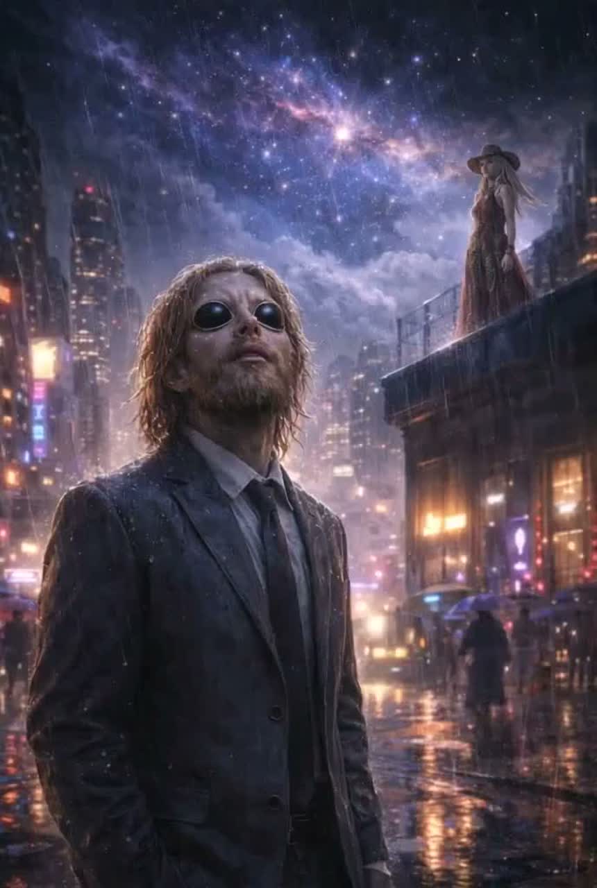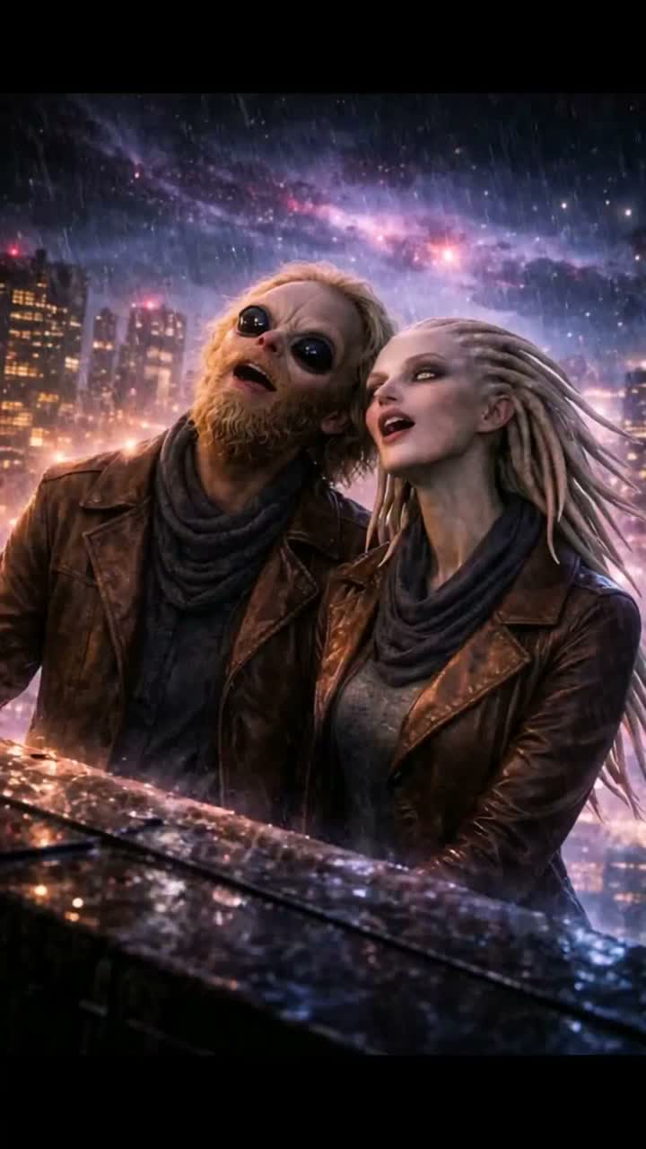 Theme: Darek walking through rainy city streets on Earth after meeting the alien traveler Aevri’Meer, cosmic love and destiny, Epic chorus, atmospheric verses, cinematic build, mystical sci-fi mood, 100 BPM