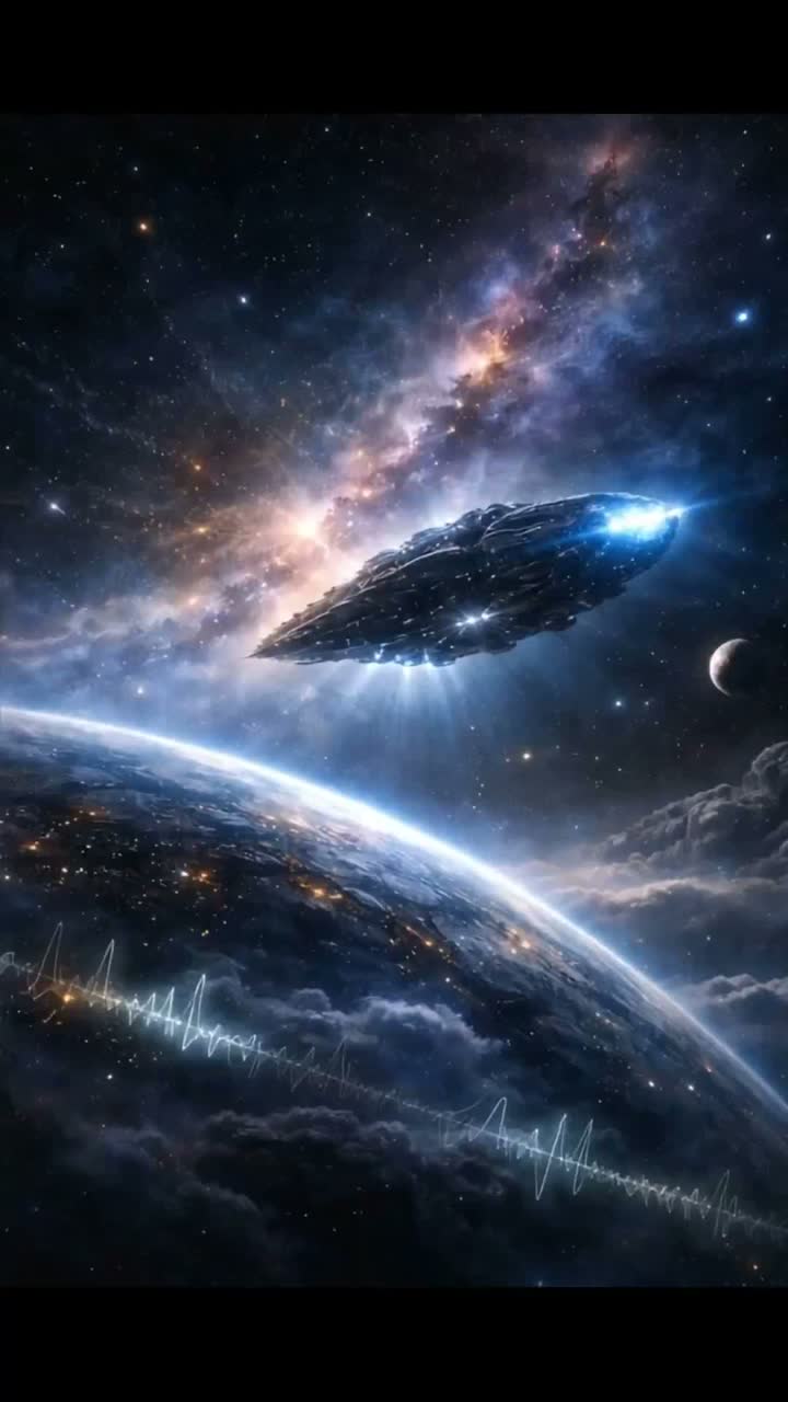 Cinematic progressive space rock intro, atmospheric and mysterious, analog synth pads, Moog textures, distant electric guitar swells, slow cinematic drums, radio static and cosmic ambience, mystical choir textures, feeling of a spaceship approaching Earth, epic sci-fi atmosphere, gradual build, 90 BPM