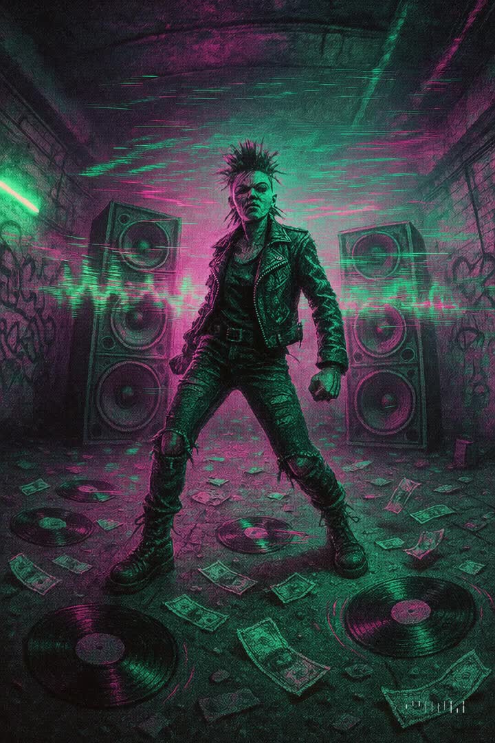 Female vocals alternate between clear lyric soprano lines and raw, operatic belting in anthemic choruses, delivering high-impact hooks, A cyberpunk rock assault blending retro synth grit with overdriven guitars and industrial swagger, Vocals are snarled, processed, and layered with vocoder menace, cutting through a thick wall of analog distortion, The rhythm section slams like a machine uprising, while feedback and glitch textures keep the whole mix volatile and volatile, It’s rebellion dressed in rust and neon