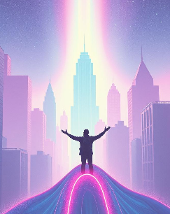 its 1992, lazer beams are all the rage, and neon lights are in the clubs, you've travelled to the future from a portal you found in your Atari game boy, you were playing pac-man and bomber man, when you felt the synth electronic waves take you through the portal wormhole, the synapses in your brain lit up as the pressure overwhelmed you, before you knew it you were neon blue in shades you'd never seen your mega drive went into hyperdrive and the pixels exploded 4 bits, 8 bits, 24 bits, 64 bits, until you were face to face with smooth sailing behind the wheel of a cyber futuristic humanoid self driving car from a parallel universe, beside yourself you hum into the abyss of code and wires in the main frame you entertain the passerby's as you chime and shoot lazer screams into the air, do they even know? do they even care?