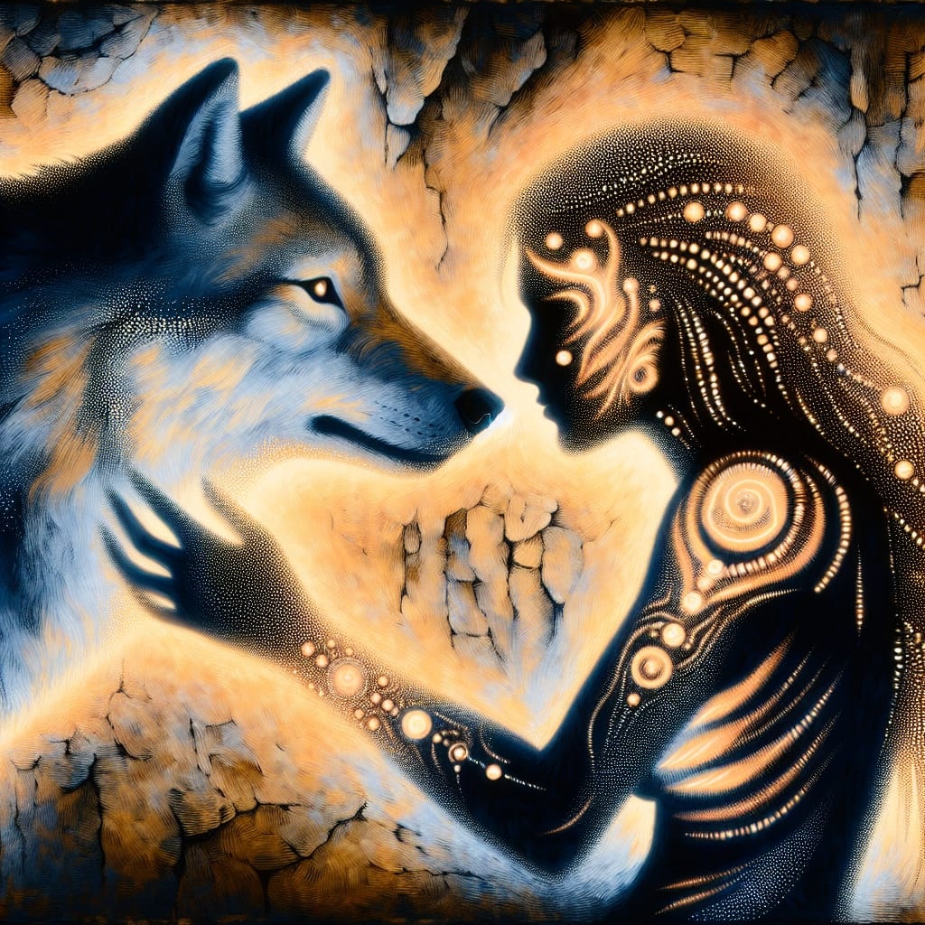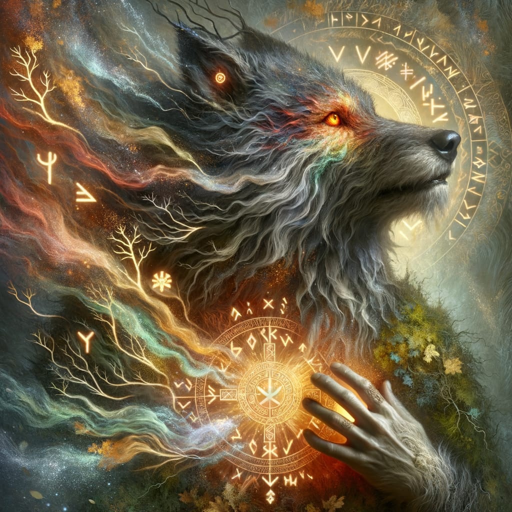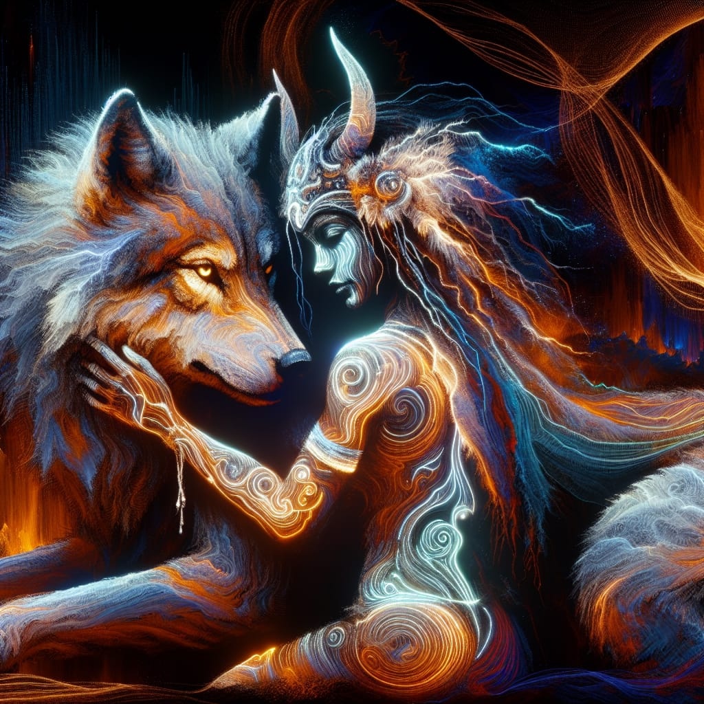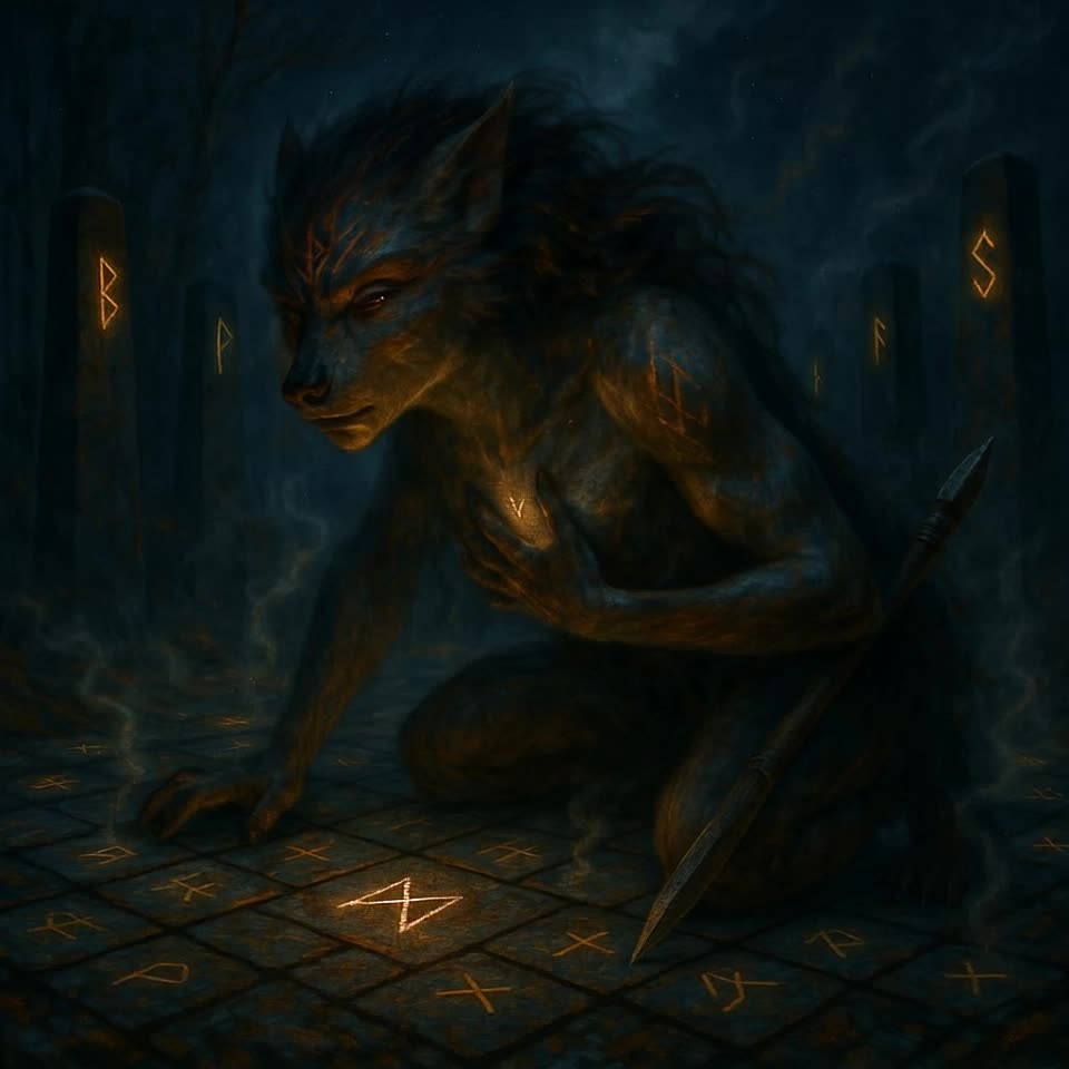 Wyrd of the Ancient Beast" — A galdra shamanic, neo-dark folk journey filled with primal drumming, guttural growls, and Paleolithic archetypal energy, Aggressive frame drums pulse like the heartbeat of the earth, while a warrior’s voice chants in Proto-Germanic, invoking spirits and ancient powers, Howling wolves join the atmosphere, their cries blending with dark metal sound effects and ambient soundscapes, creating a raw, intense backdrop, Galdr chants rise in rhythmic waves, piercing the air with ritualistic force, The druidic voices intertwine with primal energy, their aggressive tone heightened by piercing vocal attacks, The track builds with guttural growls and animal sounds, from the wolves to the sounds of hidden predators, all merging into a fierce, spiritual dance, Every beat is an invocation, every sound a call to ancient forces, The atmosphere is ritualistic, haunting, and deeply grounded in the earth’s pulse, seidkona paganwitch vocals