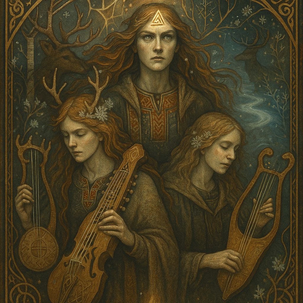 Immersive Nordic/celtic folk soundscape rooted in ancient Karelian and Swedish traditions, inspired by Gjallarhorn’s ethereal power, Features traditional instruments: bowed lyre (jouhikko), kantele (Finnish zither), hardanger fiddle, willow flute (sävljest), and bronze-age goat horns, Deep didgeridoo drones and overtone flute tones weave through layered kulning (Nordic herding calls) and runo-song chant in archaic Swedish and Finnish dialects, Rhythmic pulse driven by frame drums, shaman drums, and natural percussion (stones, bones, reindeer-hide drums), Evokes sacred forest rituals, misty lakes, and the primal call of northern spirits, Melancholic and mystical, with raw vocals and ancient modal scales (pentatonic/Dorian), capturing the spiritual connection to nature, ancestry, and myth, Rich, atmospheric, and deeply traditional — a living echo of Nordic folklore passed through centuries, ‑fast, ‑modern music, ‑childish