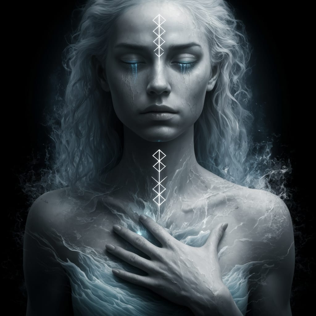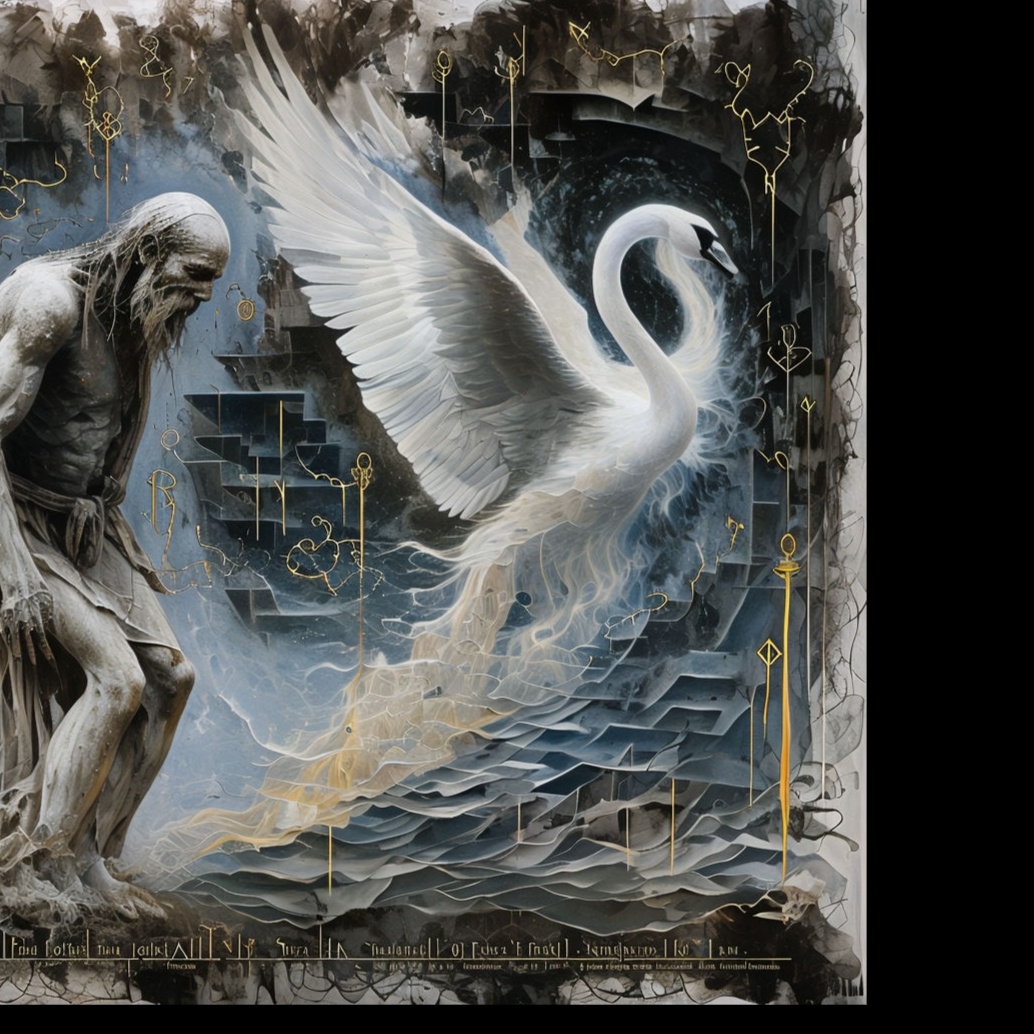 a ritualistic soundscape inspired by Norse mythology, focusing on the Path of the Swan, Begin with deep shamanic drums (tapan) for earthbound rhythms, symbolizing the sorrow of the draugr (undead warrior), Layer with guttural throat singing and chanting for spiritual weight, evoking the draugr’s ancient sorrow, Use wooden horns (lur) and bone flutes to convey ethereal, mournful tones, while hardanger fiddle adds haunting melodies, Transition to light, celestial tones using soft wind instruments and ethereal vocals representing the soul’s rise, merged with symbolic bell chimes and metallic clangs (swords and shields) to mark pivotal moments of transcendence, Incorporate subtle water sounds and nature whispers to mirror the spirit’s journey, The atmosphere should evolve from earthly sorrow to spiritual freedom, rooted in ancient Norse ritual