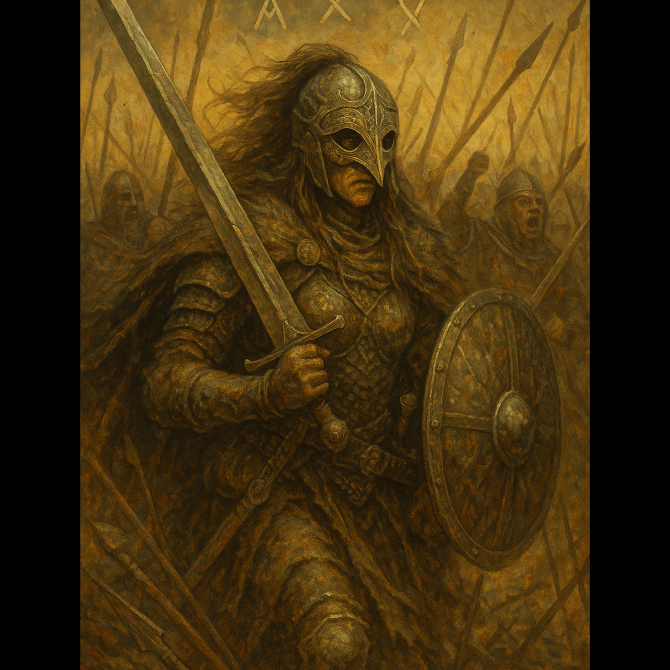"Wyrd of the Ancient Beast" — A shamanic, neo-dark folk journey filled with primal drumming, guttural growls, and Paleolithic archetypal energy, Aggressive frame drums pulse like the heartbeat of the earth, while a warrior’s voice chants in Proto-Germanic, invoking spirits and ancient powers, Howling wolves join the atmosphere, their cries blending with dark metal sound effects and ambient soundscapes, creating a raw, intense backdrop, Galdr chants rise in rhythmic waves, piercing the air with ritualistic force, The druidic voices intertwine with primal energy, their aggressive tone heightened by piercing vocal attacks, The track builds with guttural growls and animal sounds, from the wolves to the sounds of hidden predators, all merging into a fierce, spiritual dance, Every beat is an invocation, every sound a call to ancient forces, The atmosphere is ritualistic, haunting, and deeply grounded in the earth’s pulse, ‑piano