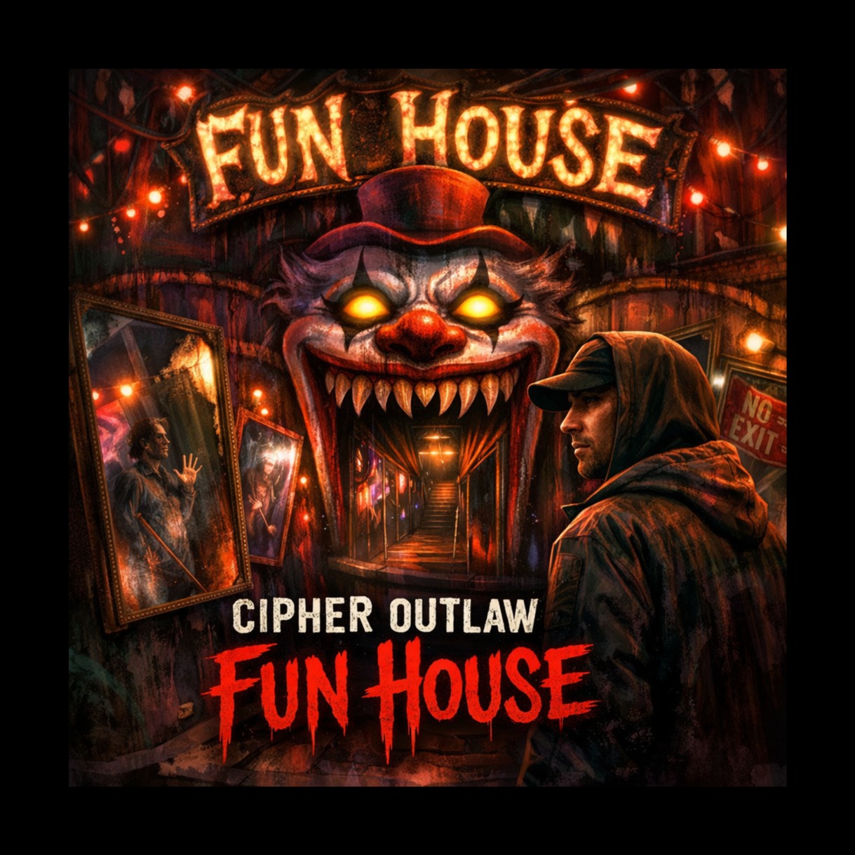 Create a 4-minute warped alt-rock / distorted hip-hop track, 'Fun House, ' Cipher Outlaw—philosopher-rapper exploring media reality, distorted mirrors, doors that don't open, MUSICAL VIBE: Warped alt-rock meets distorted hip-hop, Glitchy beats, reversed sounds, eerie samples, Bass heavy but unstable, Vocals slightly off, like coming from another room, Production feels disorienting, carnival-esque but dark, VOCAL STYLE: Male, Calm, cutting, slightly detached, Cipher Outlaw energy—philosophical bars delivered with weight, Verses steady, Hook lands, Bridge spoken over bass, Final hook more resolute, STRUCTURE: