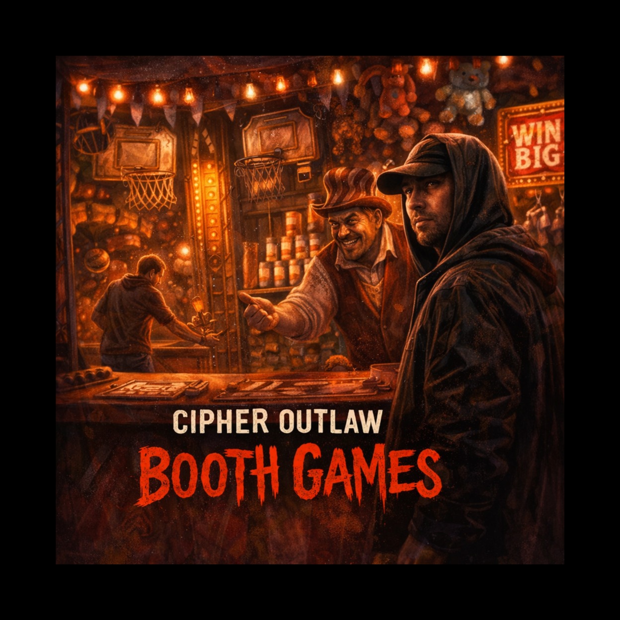 Create a 4-minute rhythmic, sarcastic hip-hop track, 'Booth Games, ' Cipher Outlaw—philosopher-rapper exposing rigged carnival games, MUSICAL VIBE: Minimal but sharp, Deep bass pulse, Crisp, tight drums, Faint distorted carnival sounds in distance, Groove that makes you nod while lyrics cut, Production feels late-night, observant, amused, VOCAL STYLE: Male, Calm, cutting, amused, Cipher Outlaw—philosopher energy with a smirk, Verses conversational, rhythmic, Hook lands with weight, Bridge spoken over bass, Final hook resolute, Outro half-spoken, beat fades, STRUCTURE: