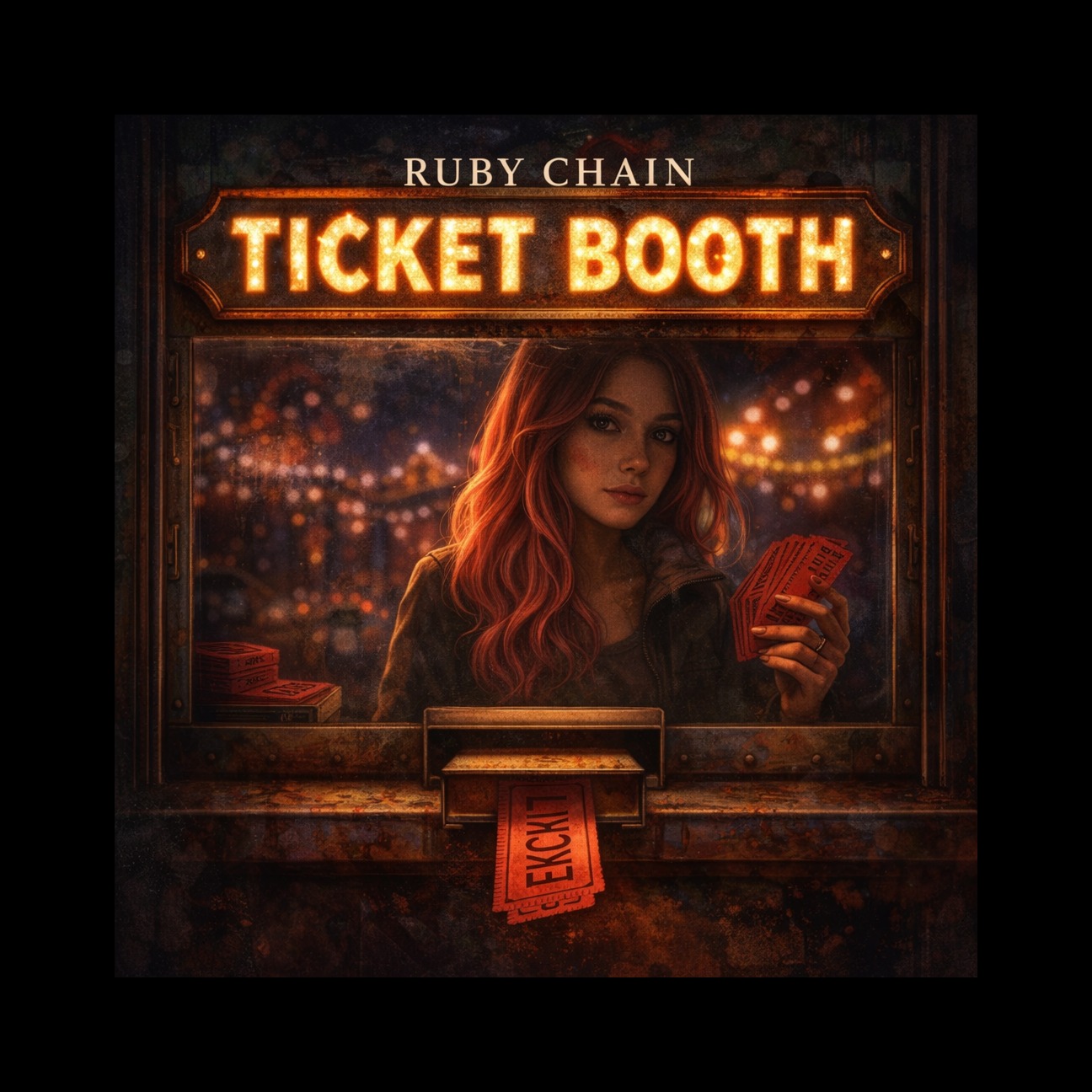 Create a 4-minute dark, transactional beat track, 'Ticket Booth, ' Ruby Chain—the voice behind the glass, watching the carnival exchange, MUSICAL VIBE: Dark, minimal, industrial, Deep bass pulse, Mechanical sounds—drawer sliding, ticket printing, Sparse, heavy drums, Cold synth textures, Production feels like a transaction happening in shadows, Claustrophobic but hypnotic, VOCAL STYLE: Female, Dark, weary, knowing, Ruby Chain's shadow side, Verses detached, observational, Pre-chorus builds, Chorus lands with weight, Bridge intimate, vulnerable, Final chorus shifts—resolution, refusal, Outro spoken over fading mechanics, STRUCTURE: