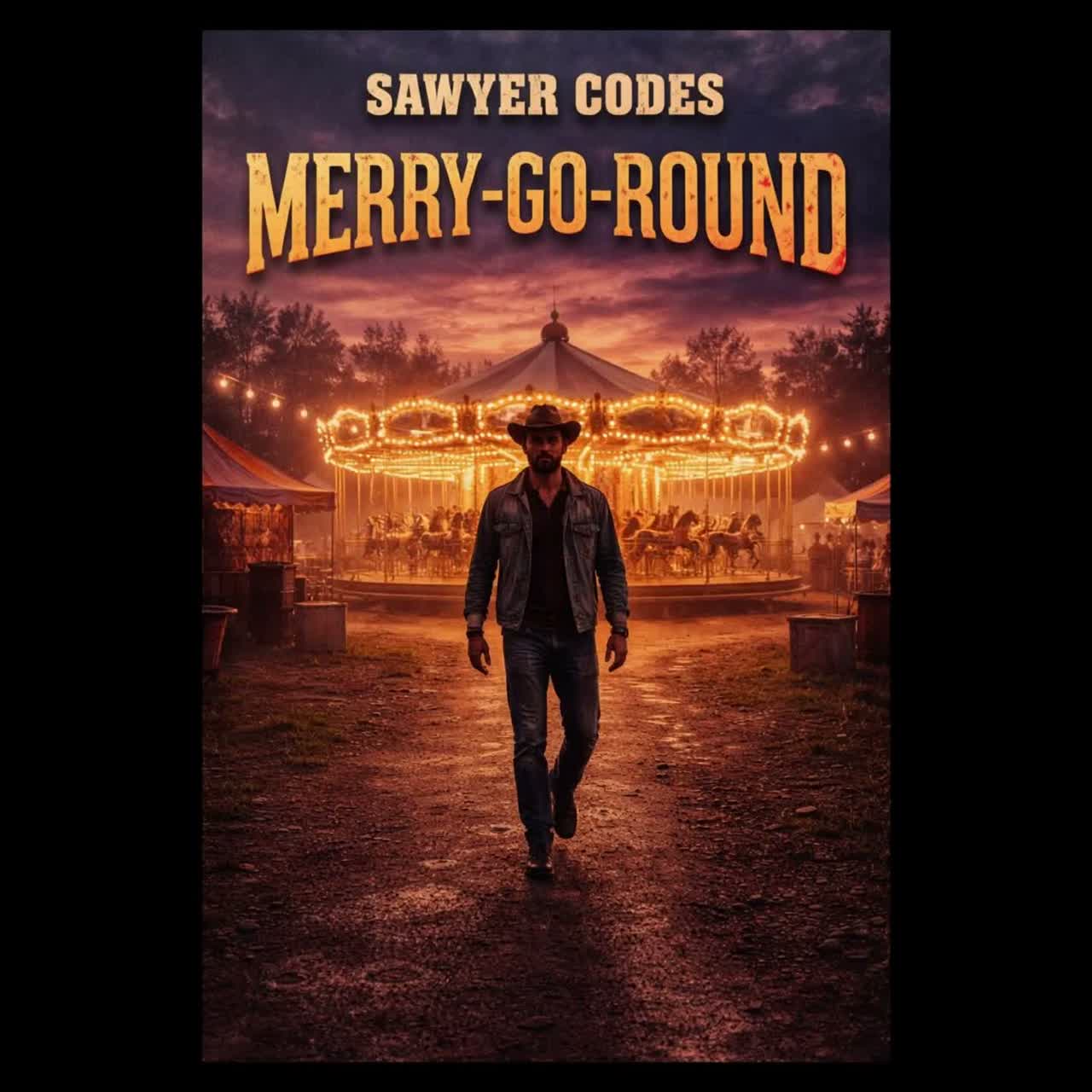 Create a 4-minute gritty folk-country-rock anthem, “Merry-Go-Round, ” Up-tempo, driving but slightly hypnotic groove, Raw Telecaster riff with circular feel, stomping kick-snare beat, warm walking bass, Faint eerie calliope organ drifting underneath like a carnival at dusk, Production feels live, sweaty honky-tonk energy with subtle room ambience, Male vocal — gritty, warm, knowing, Sawyer Codes storyteller tone, Verses conversational with wry edge, Pre-chorus builds tension, Chorus wide, singable, crowd-ready, Telecaster solo around 2:40 with bending, slightly chaotic notes, Bridge drops to intimate vocal + light drums + organ, Final chorus full tilt, big backing shouts, Outro half-spoken over fading, slightly detuned calliope, Mood: knowing, energetic, liberating, Theme: endless chasing loop — the only way off is to step down