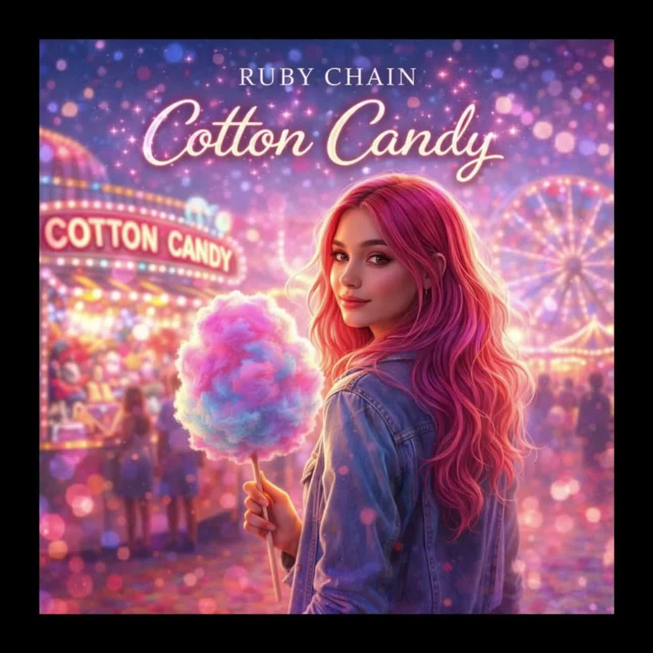 Create a 4-minute bright pop track, 'Cotton Candy, ' Ruby Chain—sweet on surface, hollow underneath, Consumerism as carnival treat, MUSICAL VIBE: Bright, upbeat pop, Sparkling synth melody, Light, danceable beat, Warm bass, Production feels colorful, inviting—but with space underneath, The sweetness should feel slightly hollow on repeat listens, VOCAL STYLE: Female, Warm, inviting, melodic, Ruby Chain—sweet delivery with hidden depth, Verses conversational, Pre-chorus builds, Chorus catchy, singable, Bridge intimate, almost vulnerable, Final chorus shifts—awareness creeping in, Outro spoken over fading sparkle, STRUCTURE: