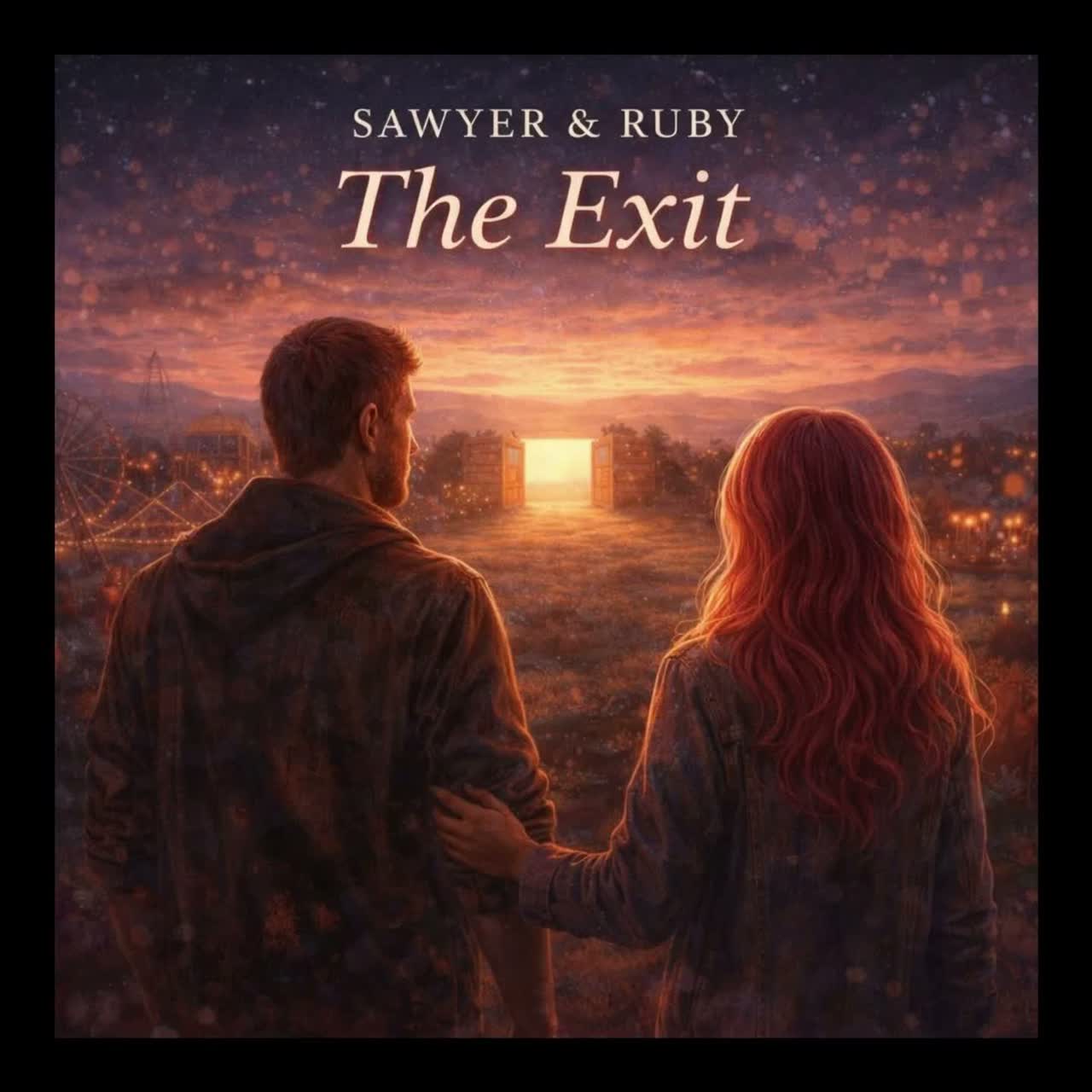 Create a 4-minute stripped, reflective acoustic track, 'The Exit, ' Sawyer & Ruby duet—closing the carnival, finally seeing the door, MUSICAL VIBE: Stripped, intimate, Single acoustic guitar or minimal piano, Sparse, patient, breathing, Production feels like dawn after a long night—quiet, peaceful, resolved, No drums, Just space, VOCAL STYLE: Two voices, Sawyer (male, weathered, wise), Ruby (female, warm, released), Both on chorus, Verses alternate, Bridge builds together, Final chorus softer, Outro spoken together, STRUCTURE: