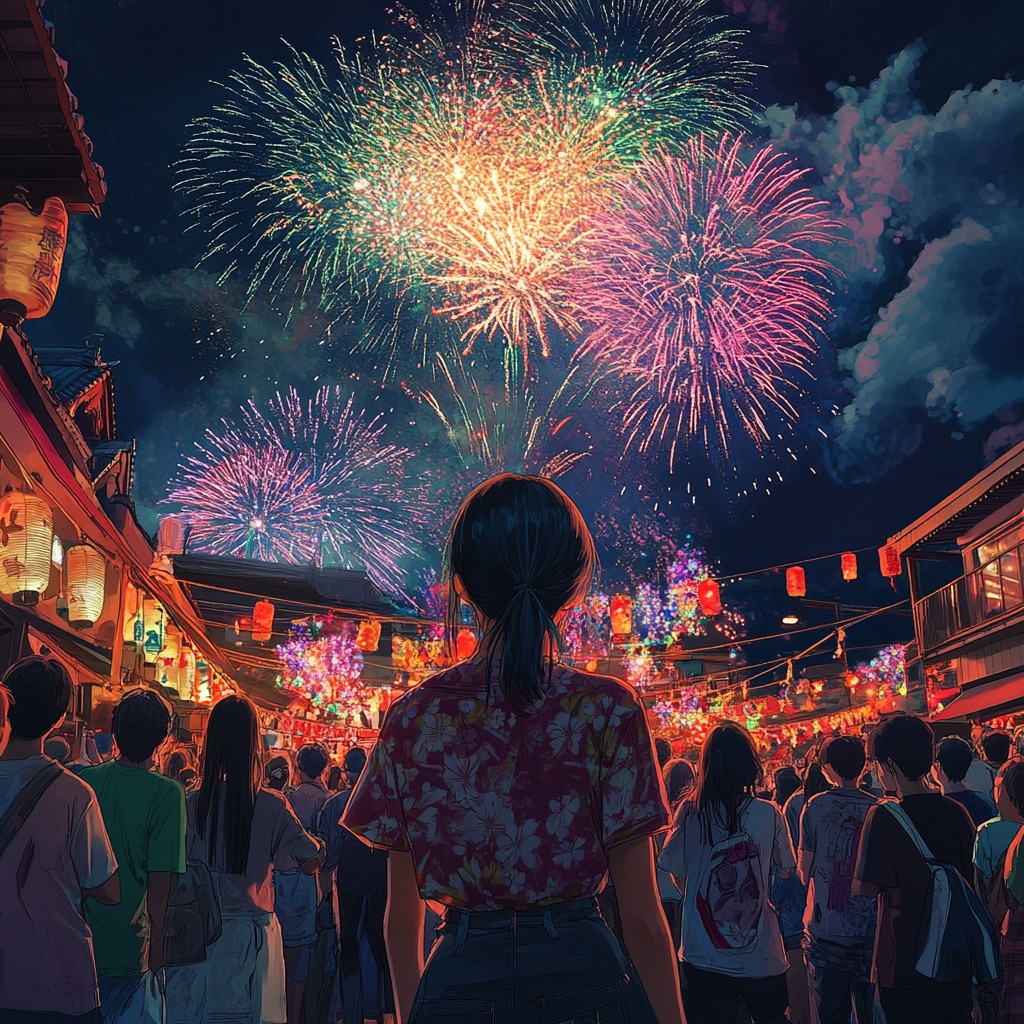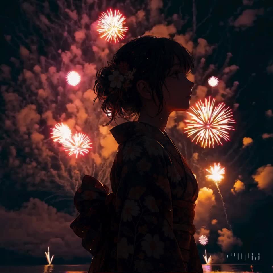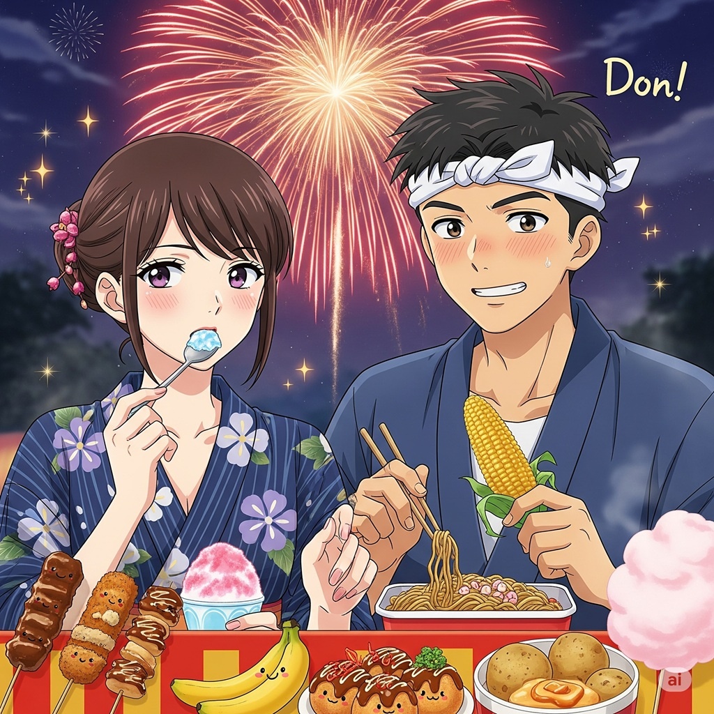 A bittersweet Japanese summer ballad sung by a young male vocalist, with soft piano, subtle taiko drums, and ambient firework sounds, The lyrics tell the story of a boy working at a food stall during a festival, hiding his feelings for a girl he couldn't confess to, He watches her walk by in a yukata, hand in hand with someone else, while quietly flipping takoyaki under the fireworks, The music should feel nostalgic and emotional, with a slow tempo, gentle instrumentation, and a climax filled with shimmering strings and distant fireworks, The mood is tender, reflective, and quietly heartbreaking—like watching summer love fade in the glow of a festival night