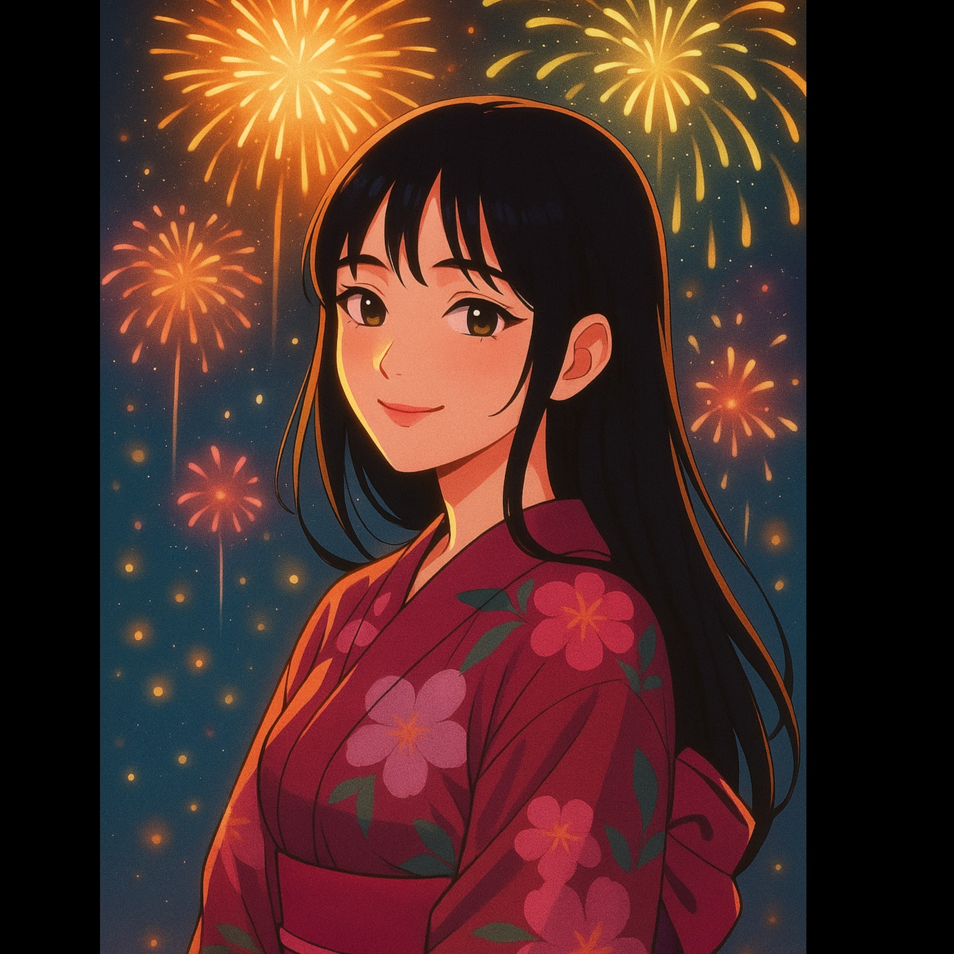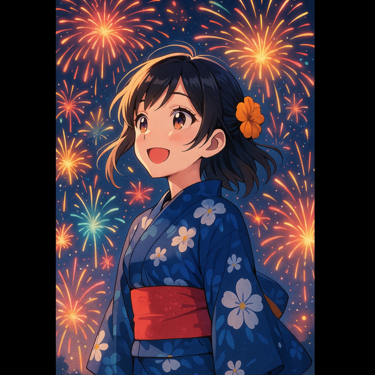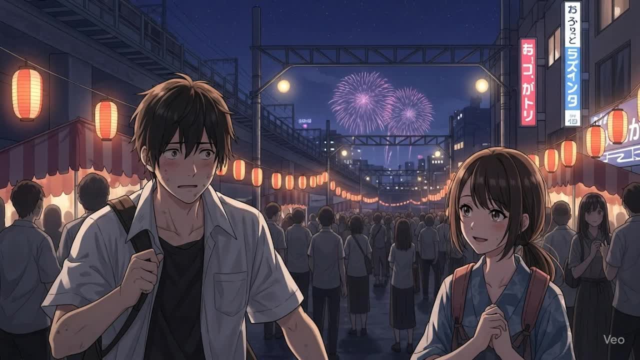 A bittersweet Japanese summer ballad sung by a young male vocalist, with soft piano, subtle taiko drums, and ambient firework sounds, The lyrics tell the story of a boy working at a food stall during a festival, hiding his feelings for a girl he couldn't confess to, He watches her walk by in a yukata, hand in hand with someone else, while quietly flipping takoyaki under the fireworks, The music should feel nostalgic and emotional, with a slow tempo, gentle instrumentation, and a climax filled with shimmering strings and distant fireworks, The mood is tender, reflective, and quietly heartbreaking—like watching summer love fade in the glow of a festival night