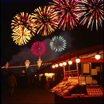 Upbeat retro Japanese rock with 3-chord structure, inspired by 1990s festival pop-punk and Enka melodic flair, Features female vocal with sweet and expressive delivery, slightly breathy and playful, Backed by tight rhythm guitar with muted strumming, taiko-inspired drums with off-beat accents, and energetic handclaps throughout, The song evokes the feel of a nostalgic summer festival with romantic tension, mouth-watering street food imagery, and heart-fluttering moments under a giant firework-filled sky