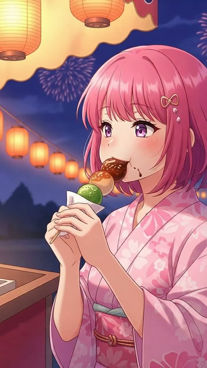 Upbeat and playful Twee Pop × Bubblegum Dance hybrid, Bright female vocal with a soft, cute tone, full of youthful energy, Instrumentation includes ukulele strums, glockenspiel, toy piano, light bubblegum synths, slap bass, and bouncy drums, Tempo: 156 BPM, 4/4, swung rhythm, Key: F Major, Verses use simple ukulele and percussion to highlight vocals, pre-choruses introduce glockenspiel sparkle and tempo lift, and choruses bloom into layered synths, handclaps, and harmony vocals, Include a brief lo-fi pizzicato breakdown in the bridge, followed by a modulated final chorus with festival bells, Mood: joyful, nostalgic, carefree, and hungry-for-life, Inspired by Japanese summer festivals, street food stalls, and first crushes under colorful lanterns