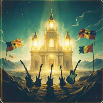 Southernrock mit einer dunklen Männlichen Stimme, ein Chor im Hintergrund mit Engelsgesang, hebräischer, Orientaler Style, Elektro Gitarren und Drum solo, Dudelsack