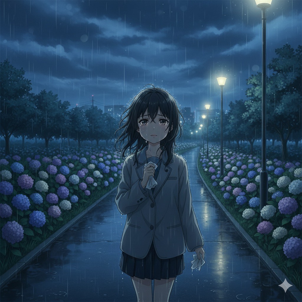 Sorrowful J-Pop ballad with haunting piano, mournful strings, and delicate acoustic guitar, Rainy, melancholic vibe evoking heartbreak and longing, Tender, tearful vocals with a touch of despair