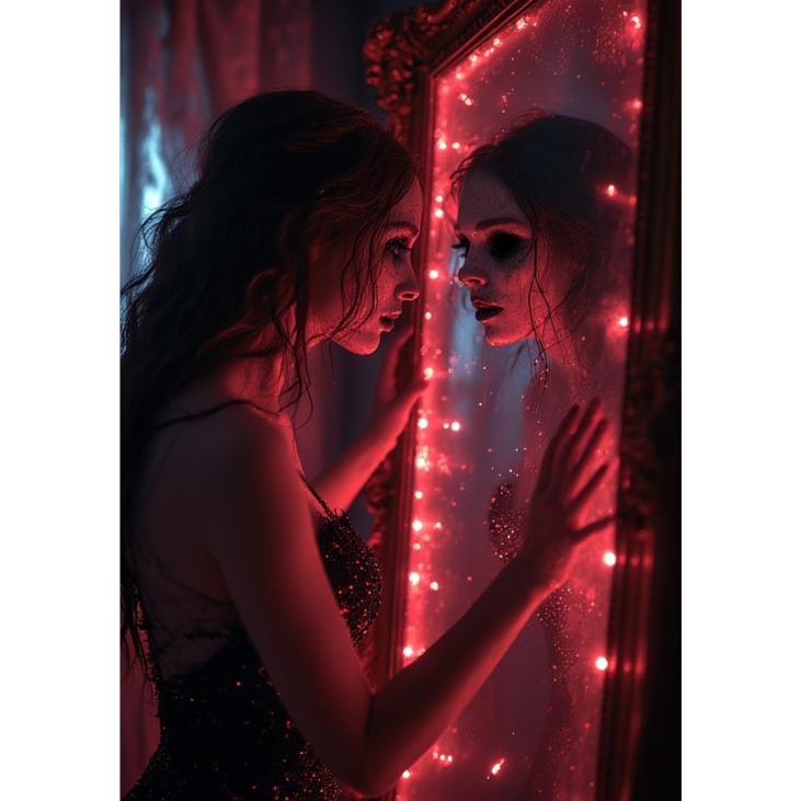 Opens with sparse, haunting synth pads and fractured, glitchy percussion, setting an uneasy pulse, Eerie vocal whispers and reflection-like FX creep in, Female vocals start subdued, anxious, then escalate to ferocious, distorted intensity, Industrial drums and hammering bass join mid-song, spiraling into chaotic, primal dance energy, Echoed layers and unsettling FX persist, steering the atmosphere toward a climactic, anxiety-ridden release that feels terrifying yet utterly danceable, Creepy, atmospheric elements haunt every section