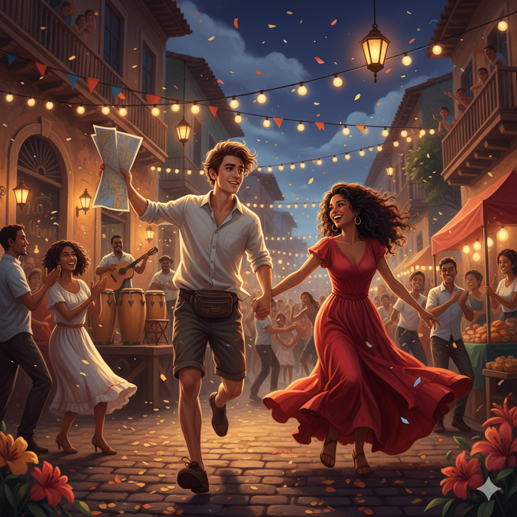 A playful Latin Jazz fusion built on a cha-cha groove, flexible enough to shift with the story, Nylon-string guitar leads with warm comping, upright bass walks with bounce, and piano montunos sparkle between verses, Percussion (congas, bongos, timbales, güiro, claves) drives the rhythm and adds comic accents timed with punchlines, Brass (trumpet, trombone) deliver cheeky stabs and slides for humor, while saxophone smooths out the romantic turns, Band call-and-response and spoken asides highlight the comedy of errors, with dynamics shifting from chaotic festival energy to intimate jazz club tenderness, The mood is romantic and mischievous, like a musical rom-com full of rhythm, laughter, and charm