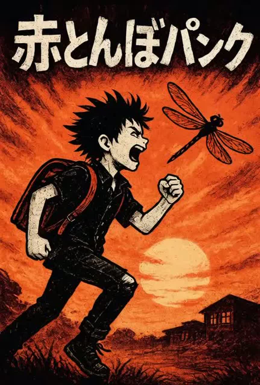 Style: Japanese punk rock with a nostalgic and playful mood, inspired by 80s–90s garage punk, Arrangement: Mid-tempo with simple power chords, raw guitar sound, steady bass and drums, minimalistic and slightly loose groove, Vocal: Child vocal (girl, age 8–12), singing in a straightforward and sincere way, not shouting, with a naive but emotional tone, Mood: Nostalgic yet innocent, evoking childhood memories of sunsets, schoolyards, and red dragonflies, expressed through punk energy, Chorus: Catchy and anthem-like, easy to sing along, with the charm of children singing passionately but simply