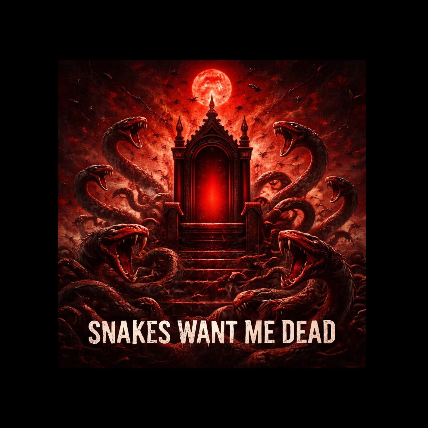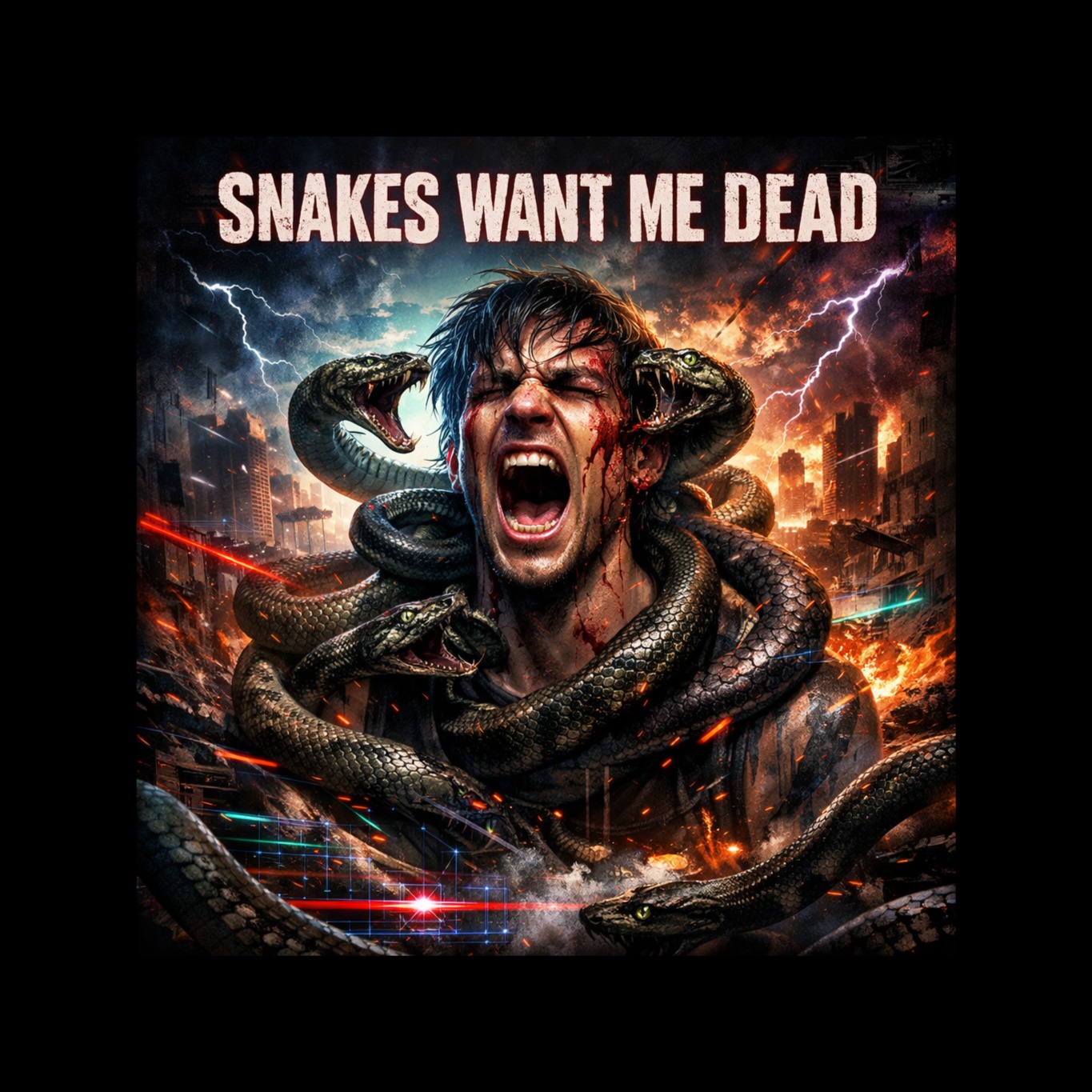 Generate a BMTH-style cinematic track titled "Snakes Want Me Dead", tempo 75 BPM, D minor, Drop C, Lyric-locked, hybrid Alternative Metal × Electronic Rock × Post-Hardcore, introspective, tense, unresolved, Follow per-section vocal, layering, and instrument rules