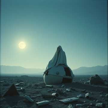 Imagery: a lone figure in a silver robe sitting on a broken satellite under a faded moon, drifting through the ruins of a forgotten civilization, searching for meaning in the silence