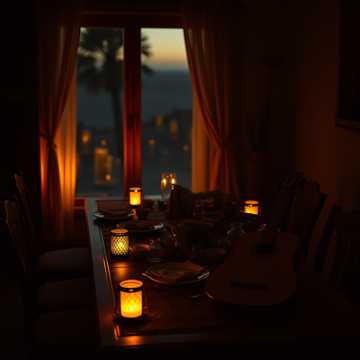 Solo oud leads with a relaxed Bayati melody, lyrical and comforting, Melodies are memorable and repeatable, unfolding with gentle phrasing and slight ornamentation, Tempo feels unhurried and content, String ensemble enters as a warm cushion, sustaining soft harmonies and occasionally reinforcing the melody, No urgency, no drama, Mood reflects shared meals, softened voices, and calm satisfaction, Organic acoustic tone, subtle dynamics, intimate yet cinematic warmth
