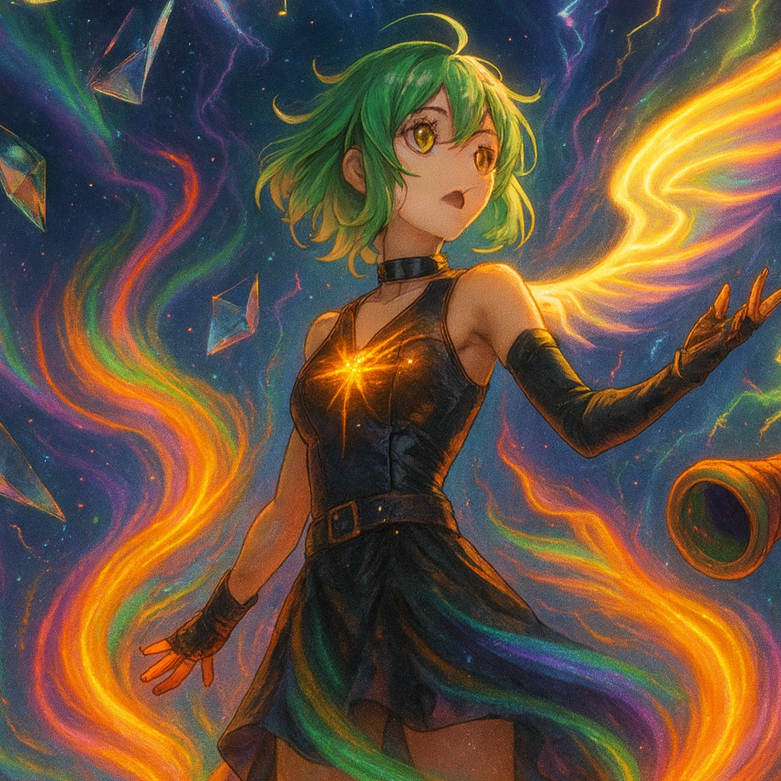 A 90s superhero power-theme colliding with symphonic metal and surreal avant-garde textures, Driving distorted guitar riffs and pounding drums carry the energy of Saturday morning cartoon intros, fused with soaring female vocals in expressive Vocaloid GUMI style, sung in English with synthetic tone and “ayy” adlibs, Orchestral brass, strings, and choir swell heroically, but twist into bizarre layers: deep didgeridoo drones as bass foundation, theremin swoops like laser beams, shimmering glass harp, dripping waterphone, and clattering detuned prepared piano, Cinematic progression with bold instrumental intro, explosive builds, mid-track avant-garde breaks, and a climactic finale spiraling upward through fiery sound, Nostalgic 90s saturation meets surreal sound design, ending in a triumphant yet otherworldly fade