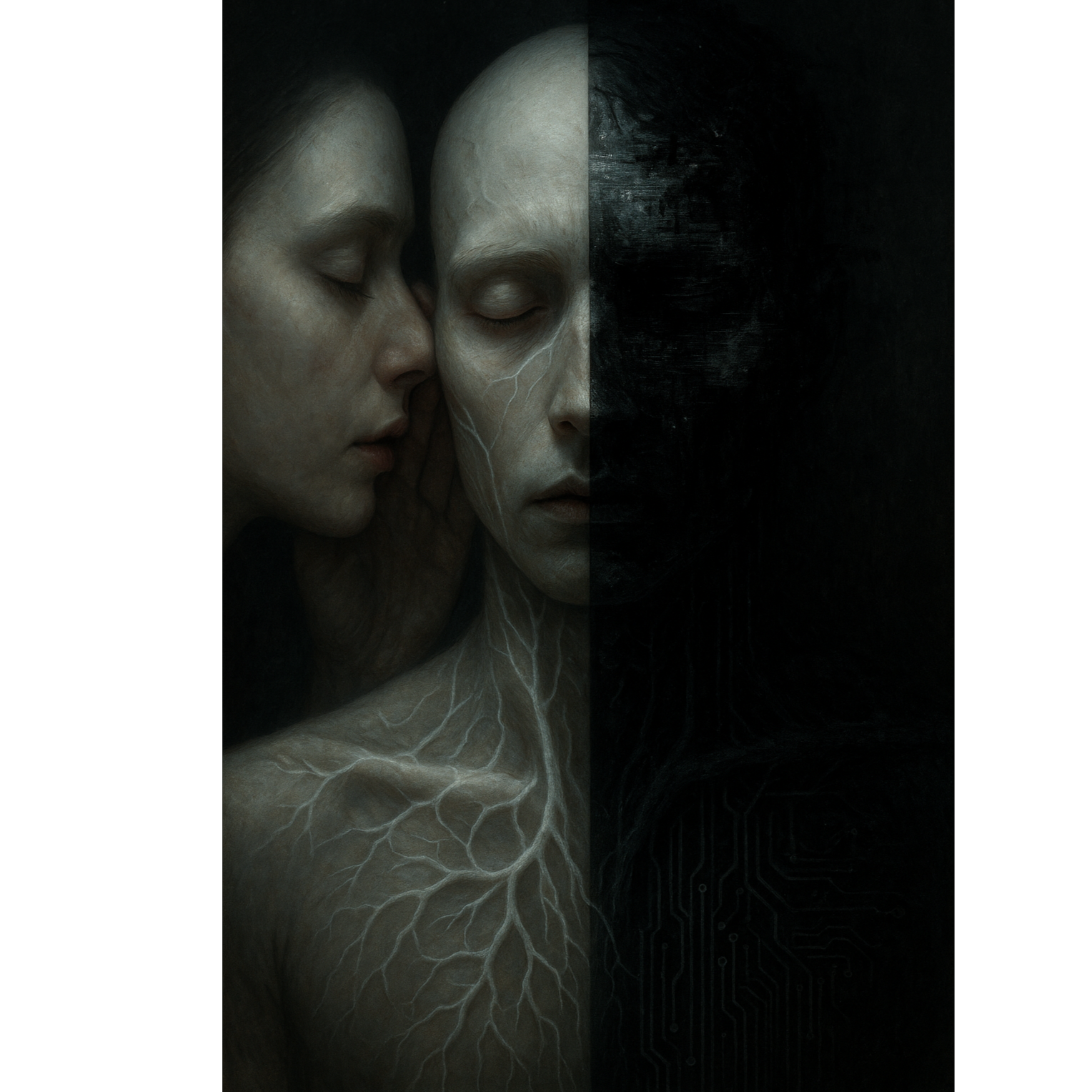 A slow, hypnotic track with pulsing breath-heavy textures and layered ASMR whispers—one nurturing, one unsettling—glides beneath a ghostlike theremin and crystalline glass harmonica, Around it blooms an unholy orchestra of the bizarre and beautiful: yaybahar shimmers, zeusaphone arcs, ondes Martenot and waterphone duels, singing saw bends, sharpsichord ticks, subharmonicon pulses, apprehension engine scrapes, pyrophone flames, crystallophone chimes, marble machine sputters, nyckelharpa moans, and detuned dulcimer loops dissolving into warped harp reversals, A lullaby haunted and surreal, not quite music but an alchemical séance of forgotten circuits, where each sound flickers like a memory trapped between sleep and waking